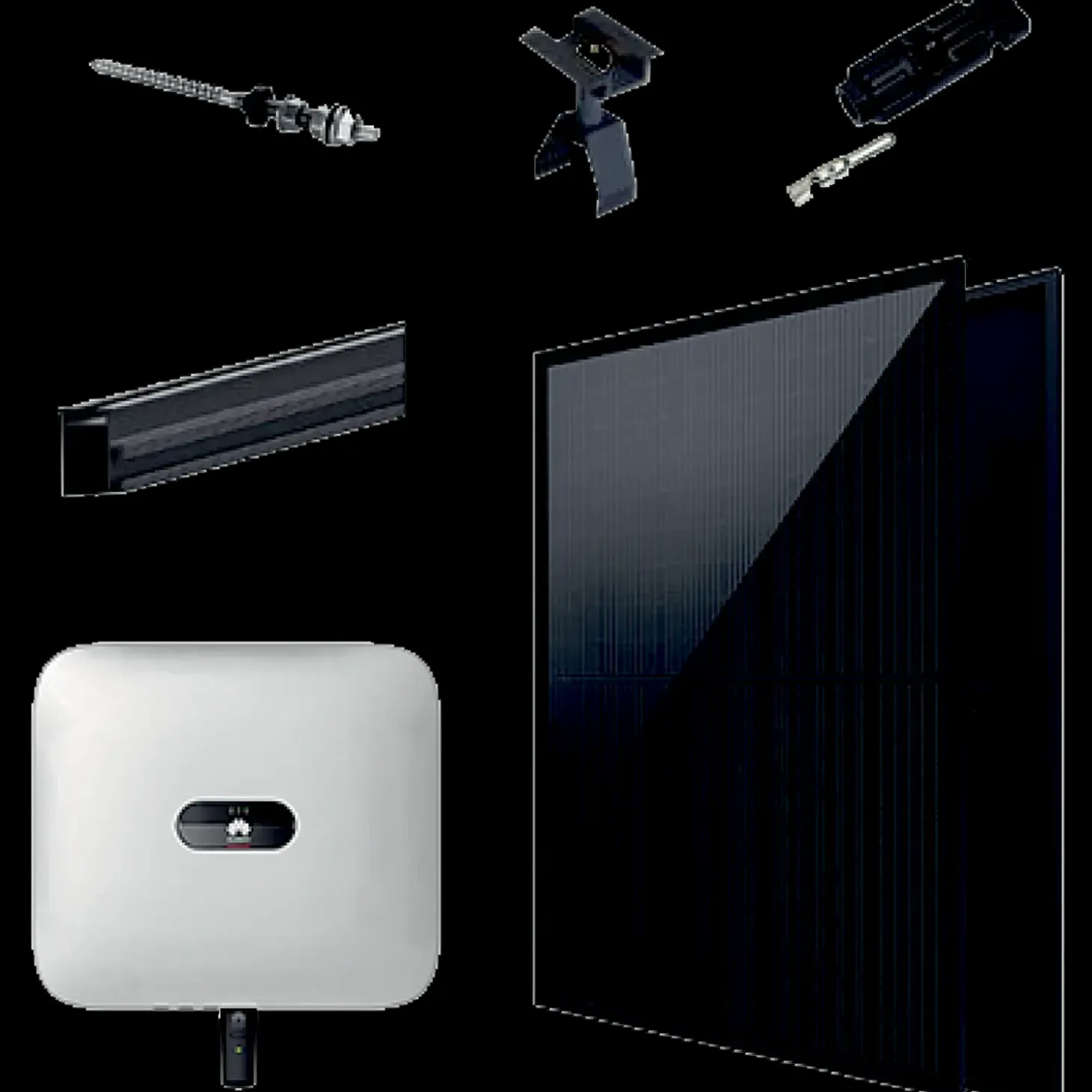 Solcellepakke til tegl- og betontag 8 stk. Hyundai solcellepaneler 430Wp 3,44 kWp, 3 kW Huawei hybrid inverter.