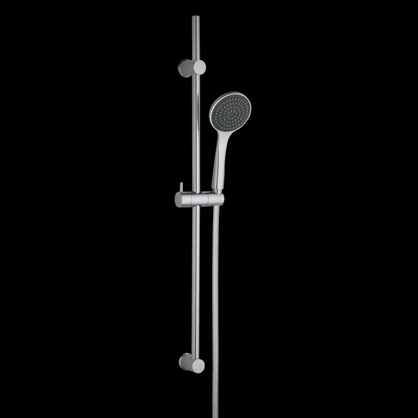 Brusestangsæt, krom. 1-spray Air-Flow håndbruser Ø100 mm med Rubber Clean gummi si og 35% vandsparer. 1,5 m silver-look bruseslange med anti-twist forskruning der modvirker snoet bruseslange. 80 cm Ø 19 mm brusestang med trinløst variabelt topbeslag. 10 års garanti.