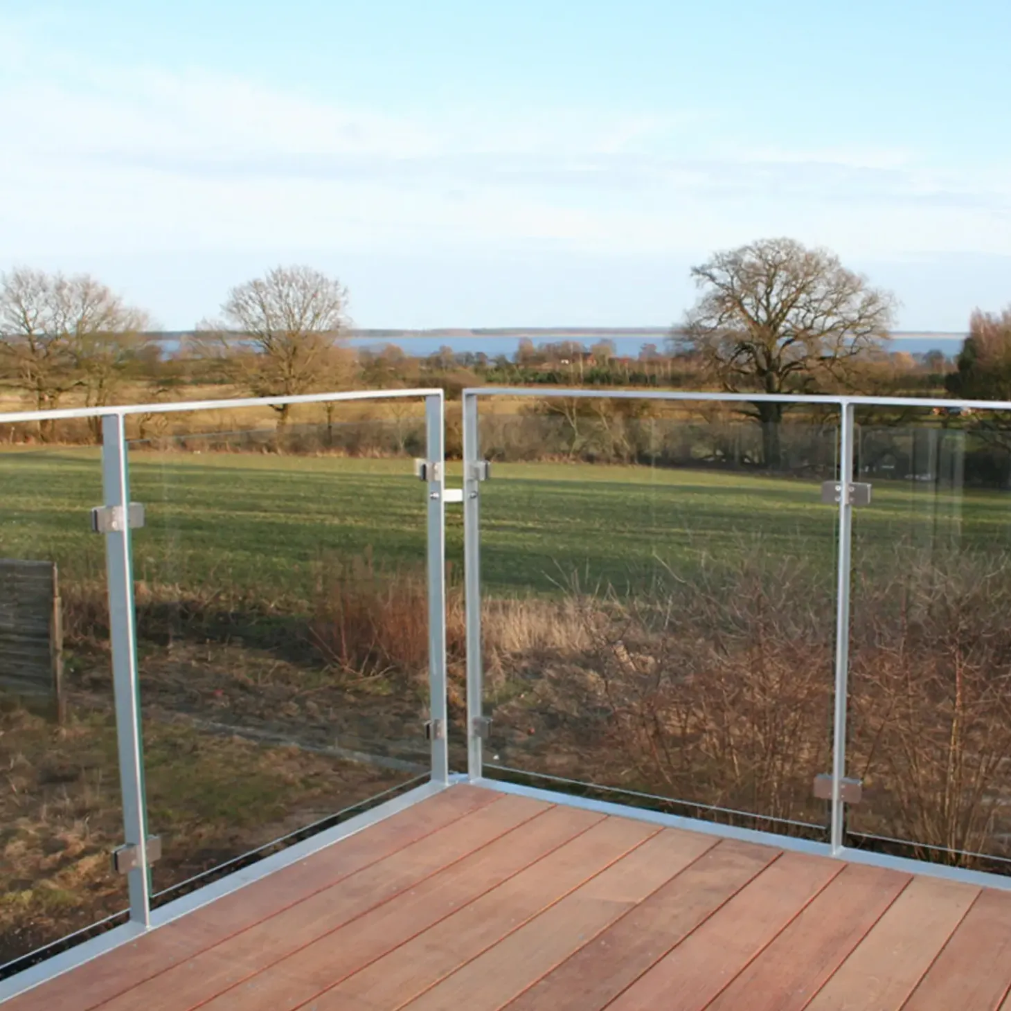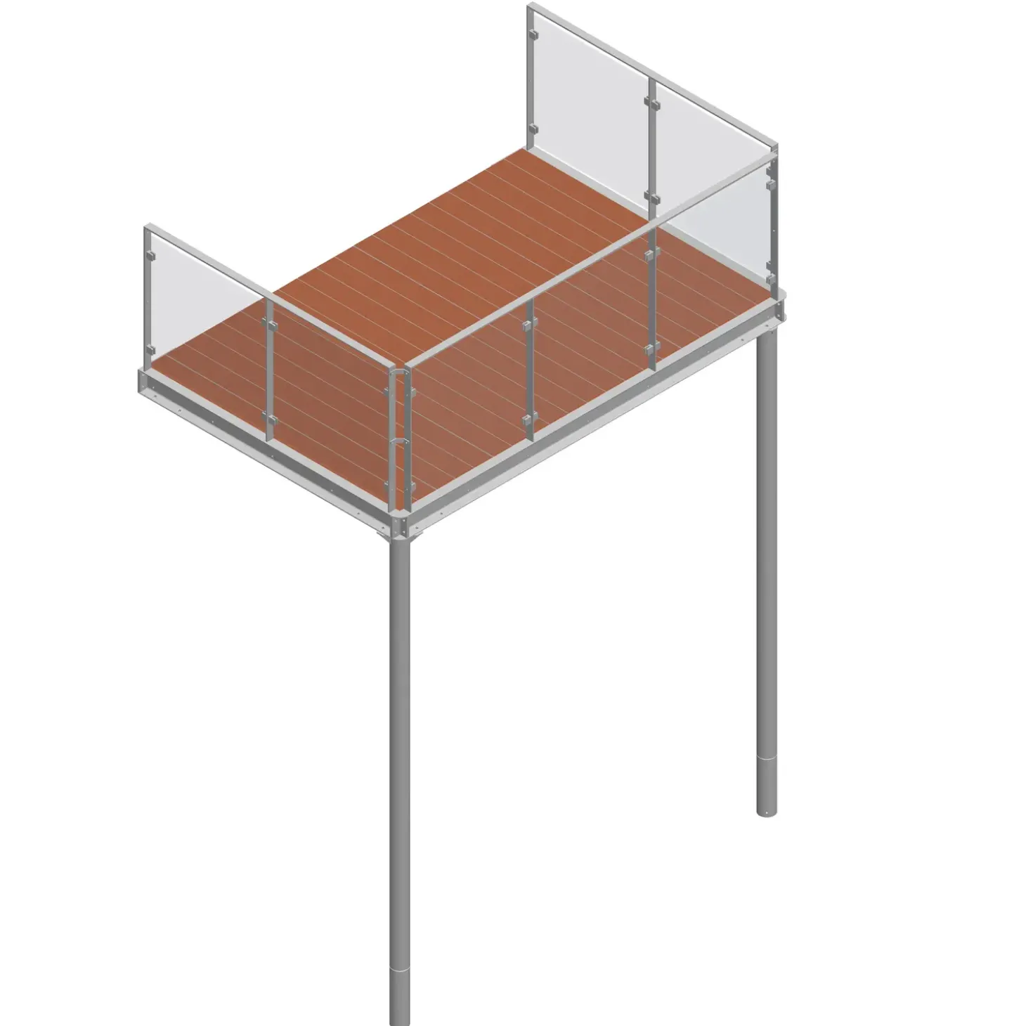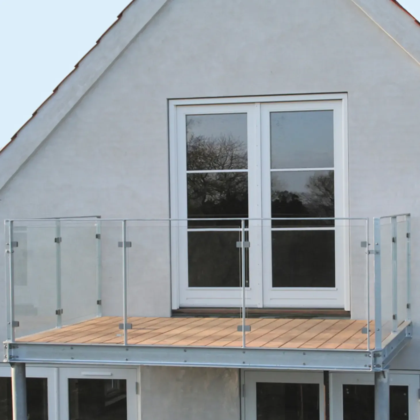 Materialer: Varmforzinket stål og terrassebrædder i hårdttræ. Værnet er i hærdet, lamineret glas.