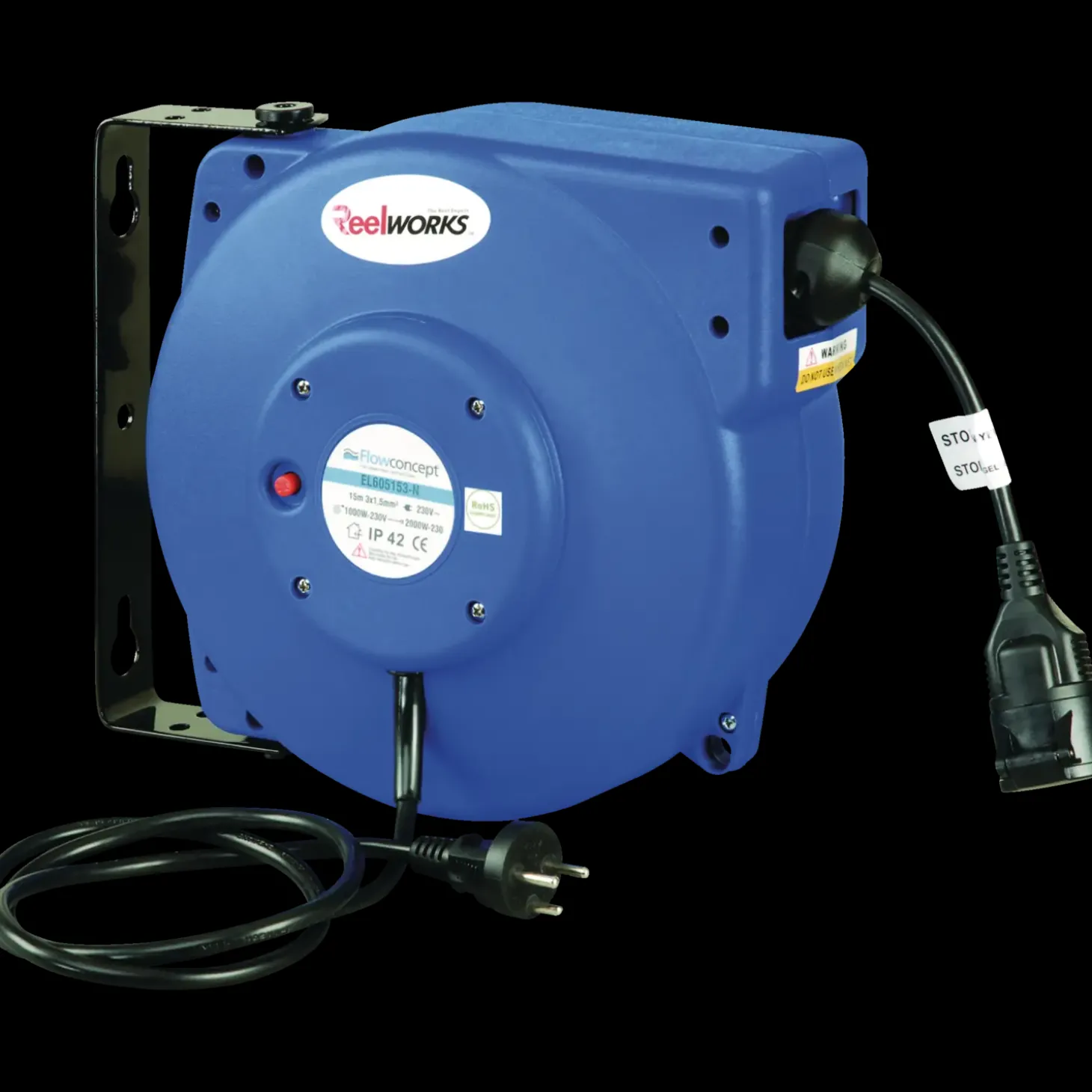 Kabel oprullerboks i slagfast polypropylen med drejeligt væg-/loftbeslag. Låser automatisk kabel ved ønsket længde.