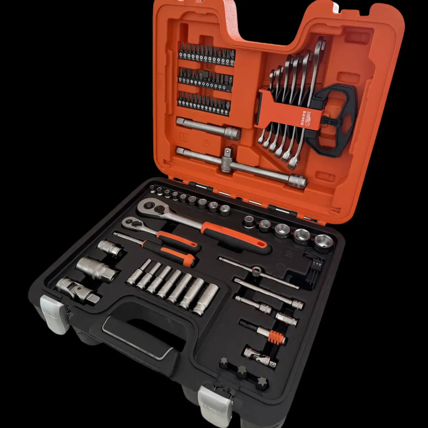 Indeholder 87 dele, toppe (4-21 mm), ring-gaffelnøgler (8-17 mm), stiftnøgler, forlængere, hele 41 bits, og diverse bitsholdere.