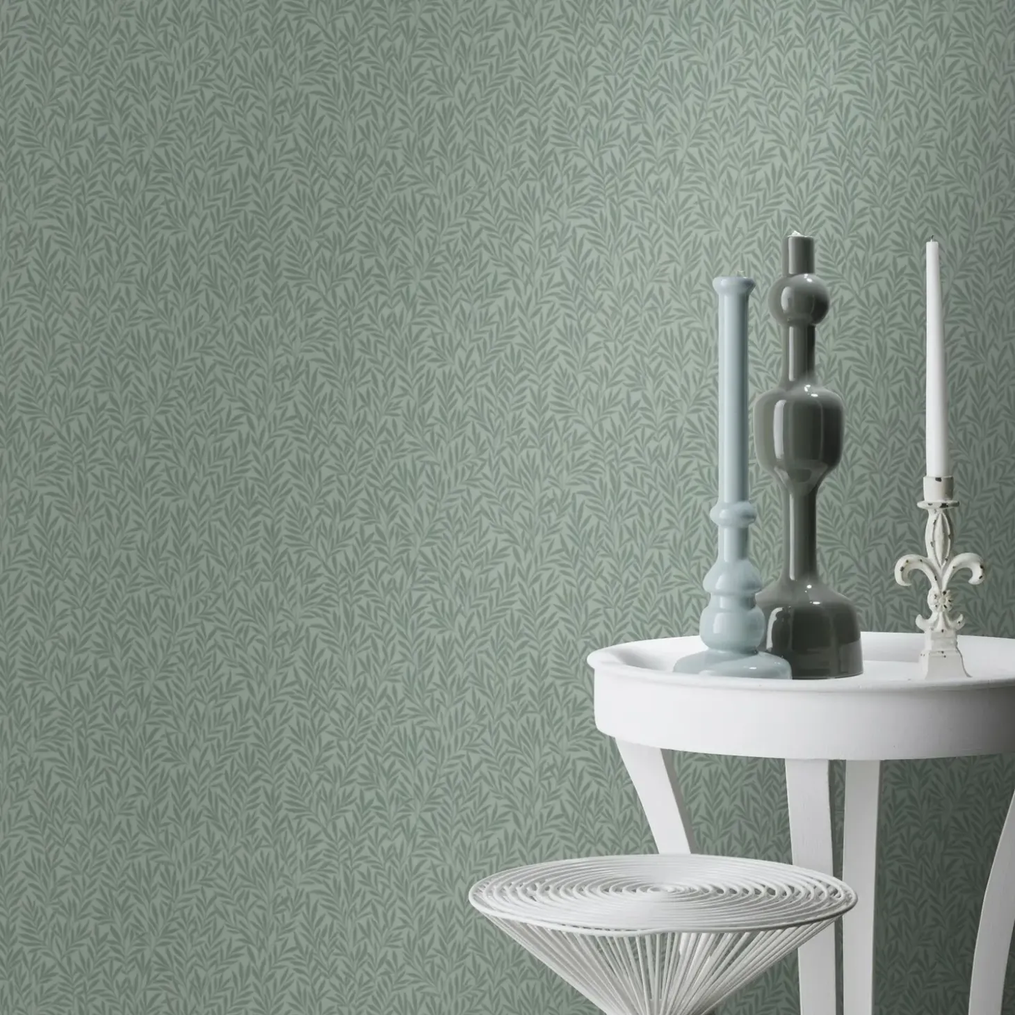 Tapet med store grene og blade der er placeret i et tæt, jævnt og harmonisk mønster.