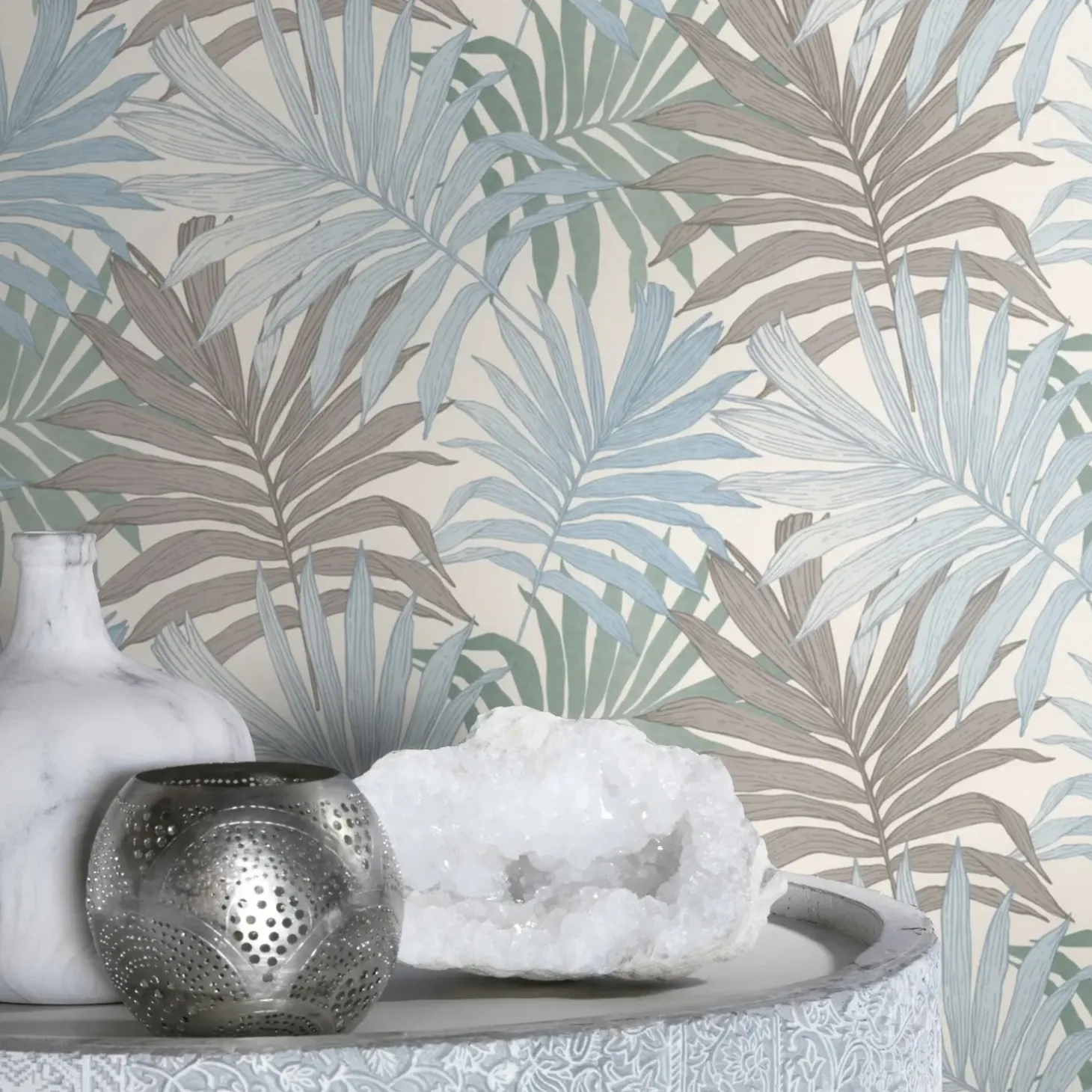 Tapet med store grene og blade der er placeret i et tæt, jævnt og harmonisk mønster.