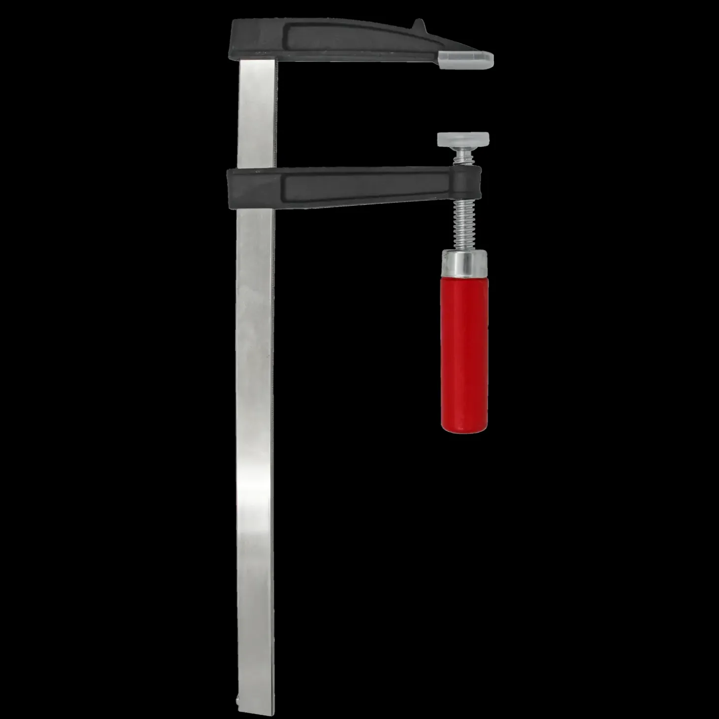 Blødstøbt skruetvinge trægreb ogt rykplader i plast, der beskytter emnet.