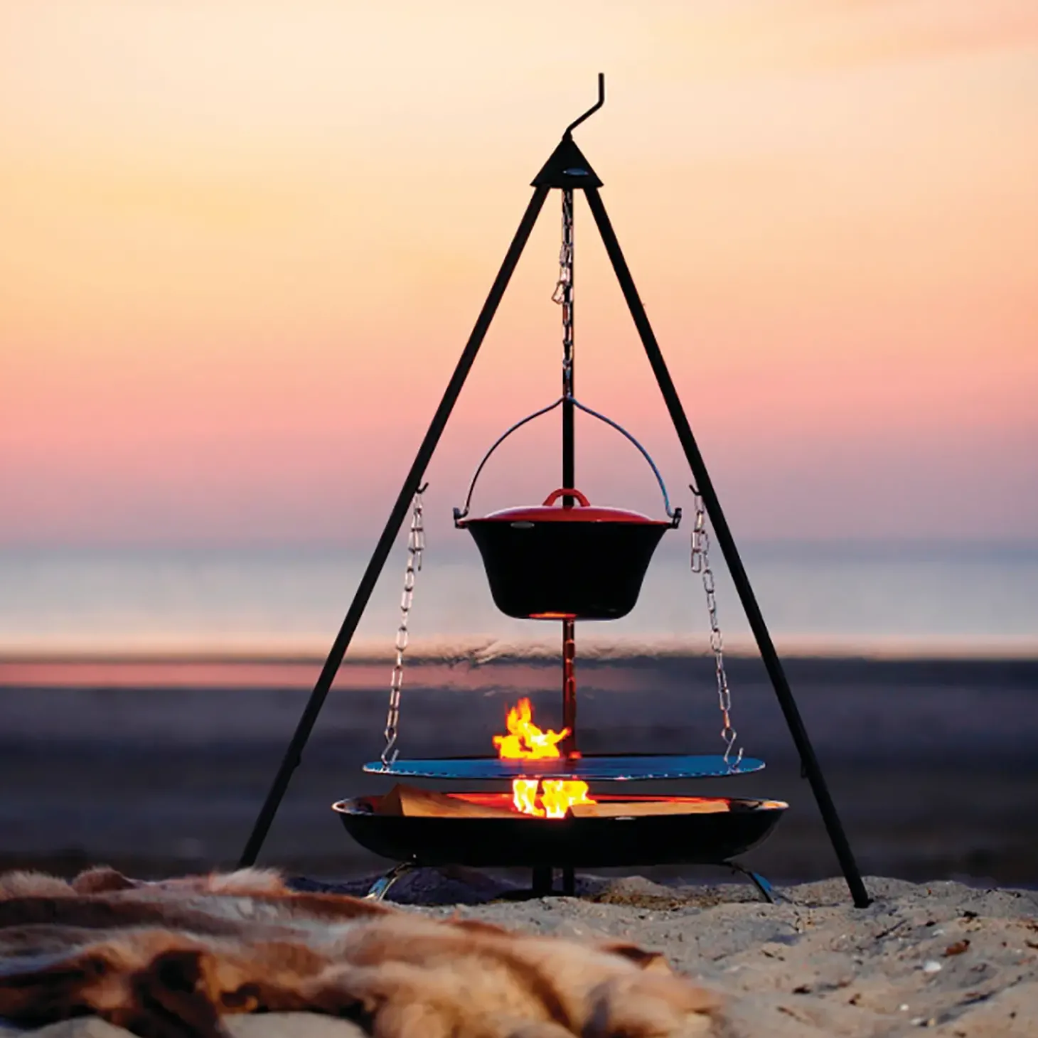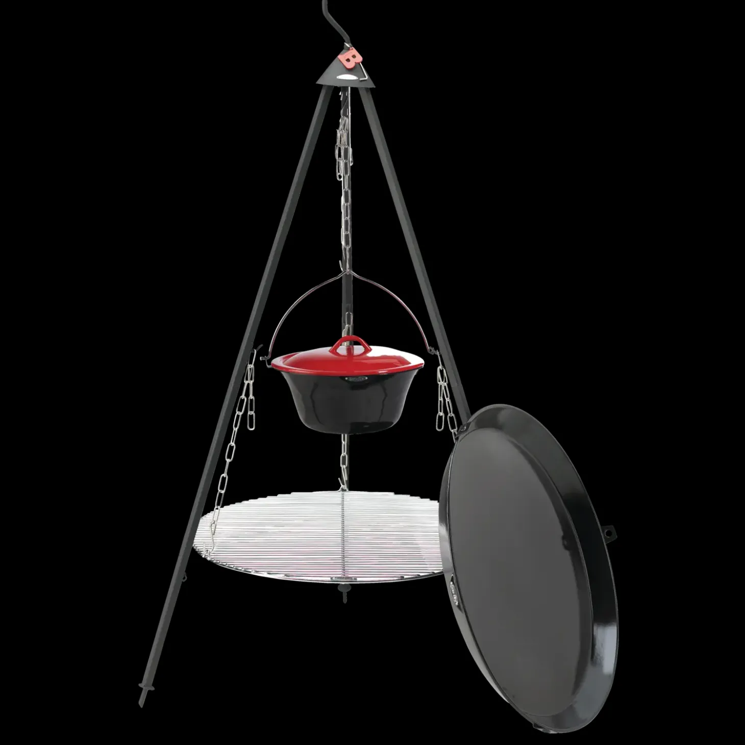 Sættet består af grillrist på Ø60 cm, tre ben, kæder til ophæng af grillrist, 6 liter gryde og stor BBQ-pande Ø60 cm.