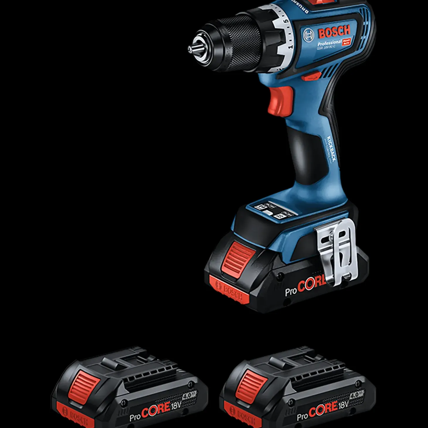 Kraftfuld professionel bore-/skruemaskine fra Bosch til krævende opgaver, lang arbejdstid med 18V 4.0 Ah ProCorre batterier.