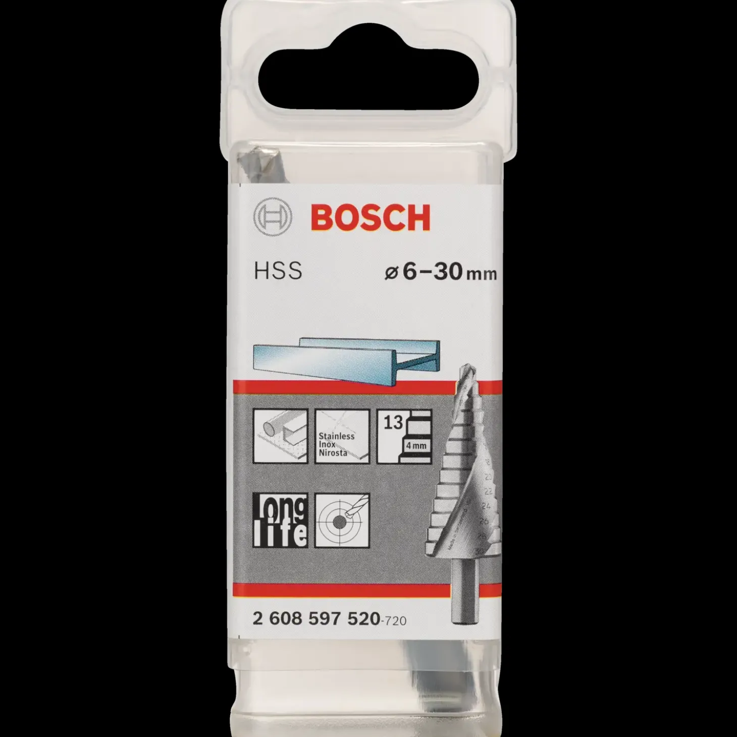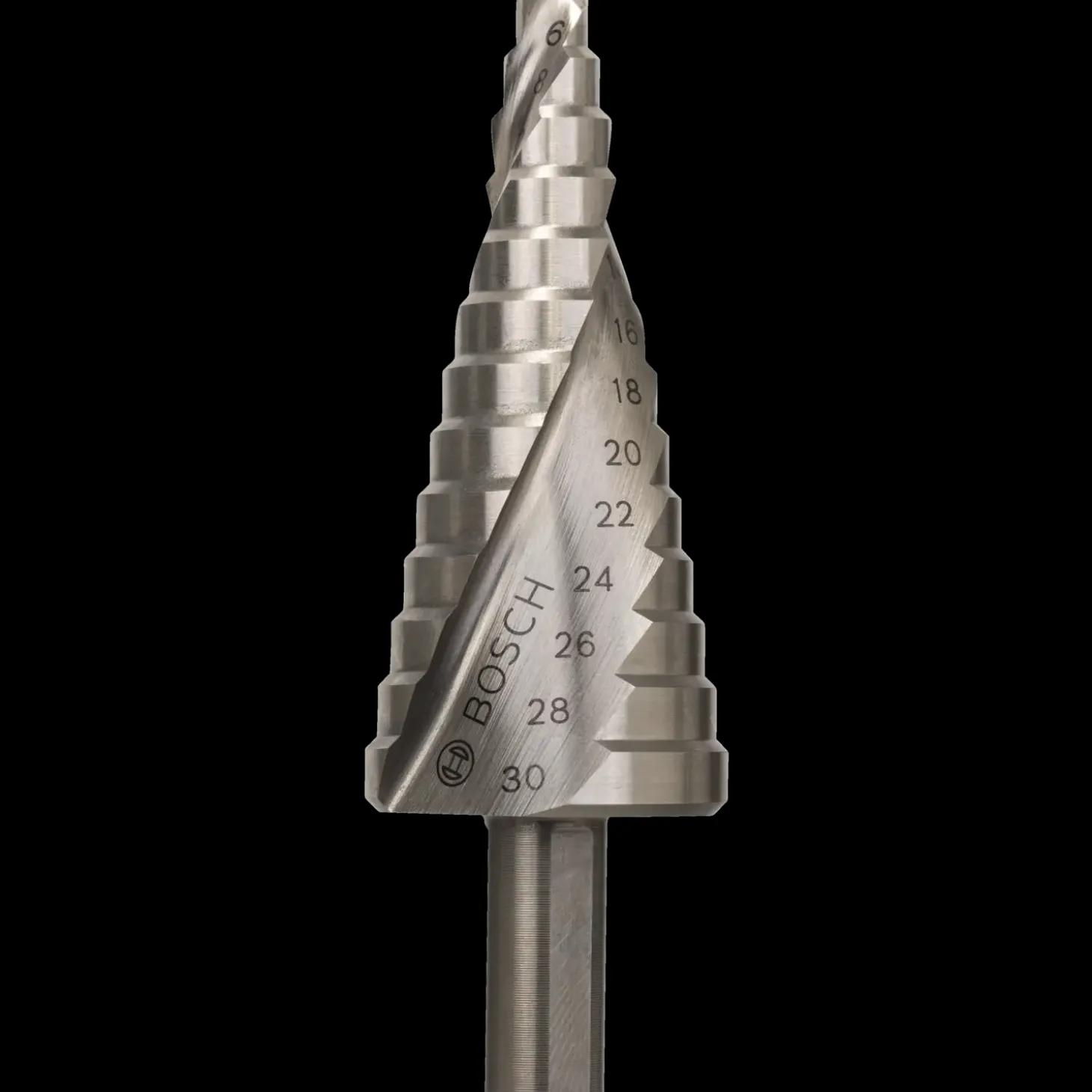 HSS boret til trinboring leverer jævn boring i flere diametre med et enkelt hammerbor. Trinhammerboret er fremstillet af HSS (hurtigstål) og giver en lang levetid ved brug af kølemiddel. Meget synlig og varig mærkning af huldiameteren leveres af lasermarkerede tal i begge spiralnoter. Desuden forhindrer 3-flat-skaftet glidning i borepatronen og giver en effektiv transmission med højt drejningsmoment.