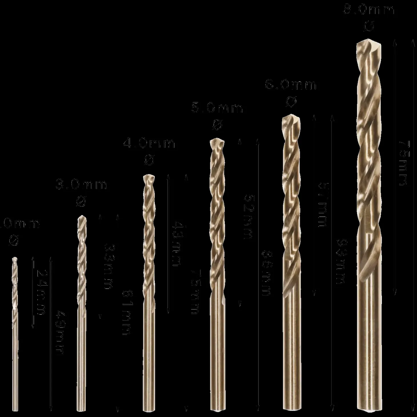 PRO Stainless Steel HSS-Co-spiralborsæt, 6 stk.Designet til boring i rustfrit stål – Er du på udkig efter bor, der kan hjælpe dig med at opnå rene snit i rustfrit stål? Bor, der arbejder hurtigt, leverer præcise resultater, og som ikke bliver slidt hurtigt? PRO Stainless Steel HSS-Co spiralbor er stærke og modvirker forskydning, så du kan bore rene og præcise huller – igen og igen. PRO Stainless Steel HSS-Co bor er et godt valg for bygningsarbejdere og montører, der har brug for langtidsholdbare bits til boring i rustfrit stål og andre metaller. Vi har fremstillet dem af førsteklasses-højhastighedsstål forstærket med kobolt (HSS-Co) og slebet dem for at sikre stor slid- og varmebestandighed. De er udstyret med en centreringsspids, så du kan etablere nye huller, præcis hvor du har brug for dem. Det betyder, at du kan arbejde hurtigere og få glæde af borets ydeevne i længere tid. Cylindrisk skaft, der er kompatibelt med borepatroner med 3 kæberDesignet til boring i rustfrit stålCylindrisk skaft, der er kompatibelt med borepatroner med 3 kæberTil boring i stål og rustfrit stål, fx ved forboring af profiler og bjælker til ankre, nitter, gevind og inventarSærdeles effektiv til bygningsarbejdere og montører: Lang standtidDiameter mm: 2,0; 3,0; 4,0; 5,0; 6,0; 8,0Arbejdslængde mm: 24; 33; 43; 52; 57; 75Totallængde mm: 49; 61; 75; 86; 93; 117Mål, sæt mm: 156,5 x 69,5 x 23