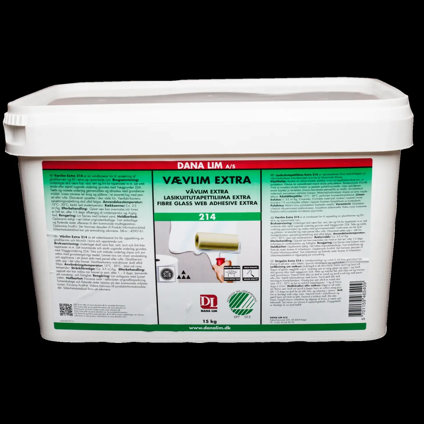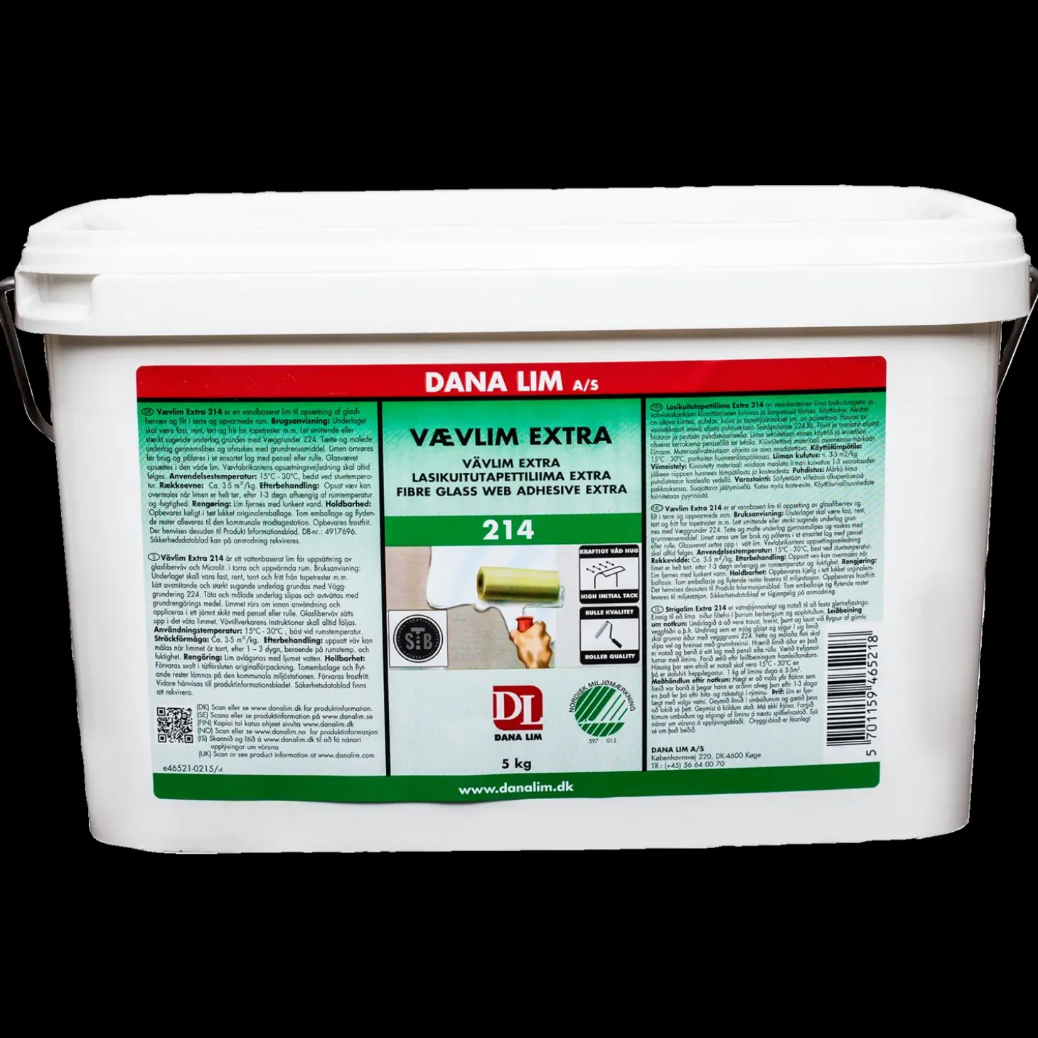 Vævlim Extra 214 er en vandbaseret lim, beregnet til opsætning af glasvæv og glasfilt i tørre og opvarmede rum.