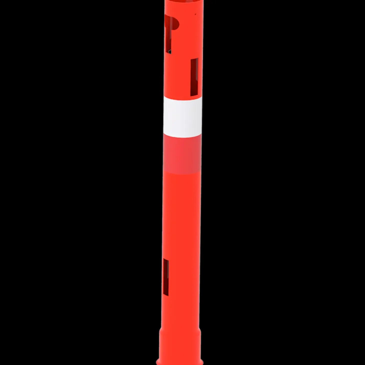 Danpæl i flourescerende rød, monteret med røde og hvide reflekser, samt seks udstandsninger til lægter, markeringsbånd samt håndtag. Kan produceres i andre farver med mulighed for specialrefleks med print.