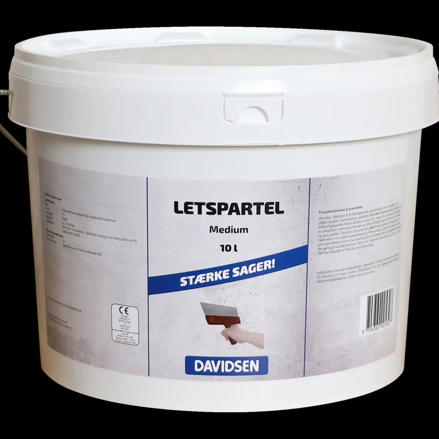 Davidsen spartelmasse medium er en færdigblandet letspartelmasse med høj vægtfylde og høj fyldningsgrad, der udmærker sig ved at være særdeles let at påføre og slibe. Spartelmassen anvendes indendørs til ud- og bredspartling af vægge og lofter af puds, beton, letbeton, gipsplader m.m. i tørre rum.