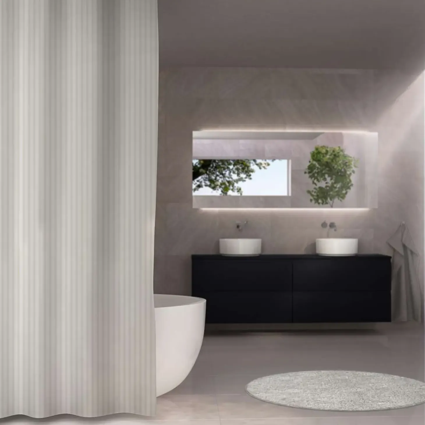 Debel Victoria badehæng i enkelt design med fine tynde satinstriber, der giver en enkelt og elegant udtryk. Badeforhænget er med indsyet tyngdebånd i bunden, så det altid hænger flot.