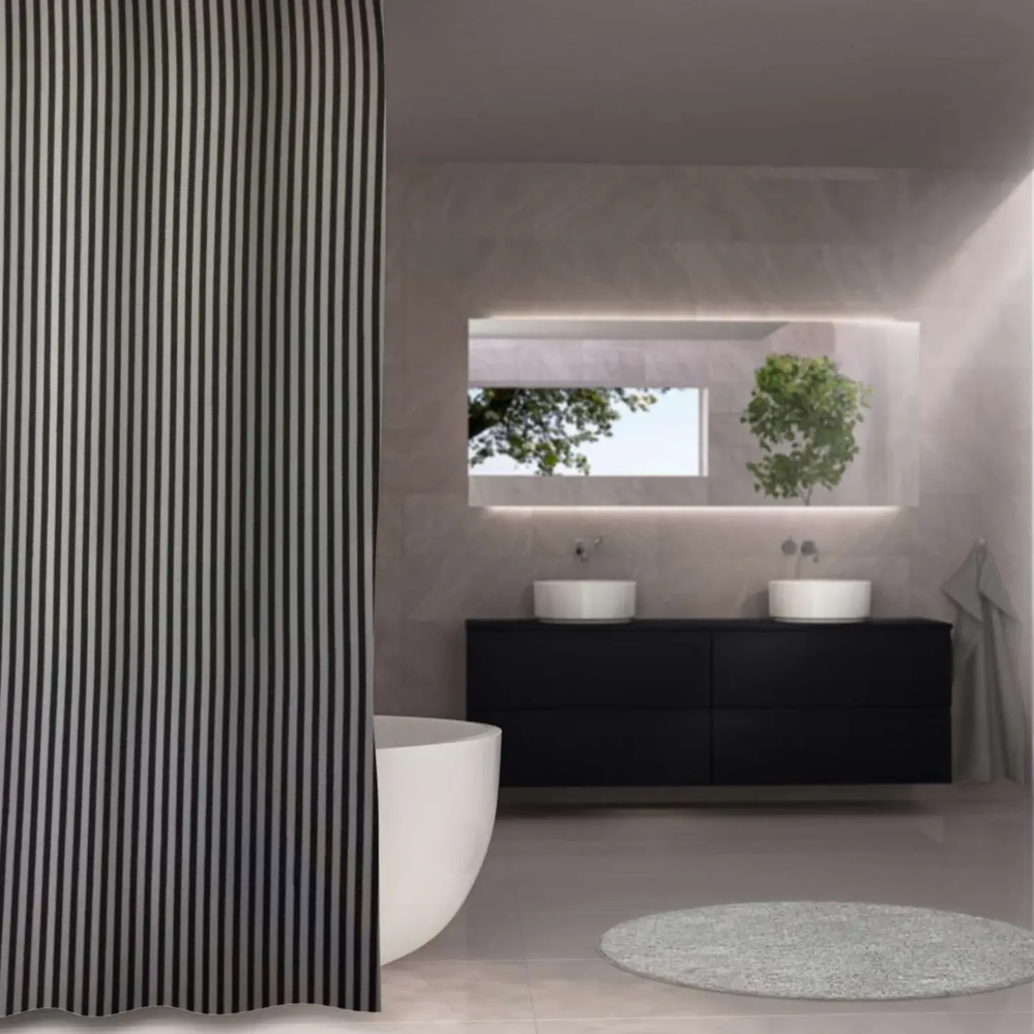 Debel Victoria badehæng i enkelt design med fine tynde satinstriber, der giver en enkelt og elegant udtryk. Badeforhænget er med indsyet tyngdebånd i bunden, så det altid hænger flot.