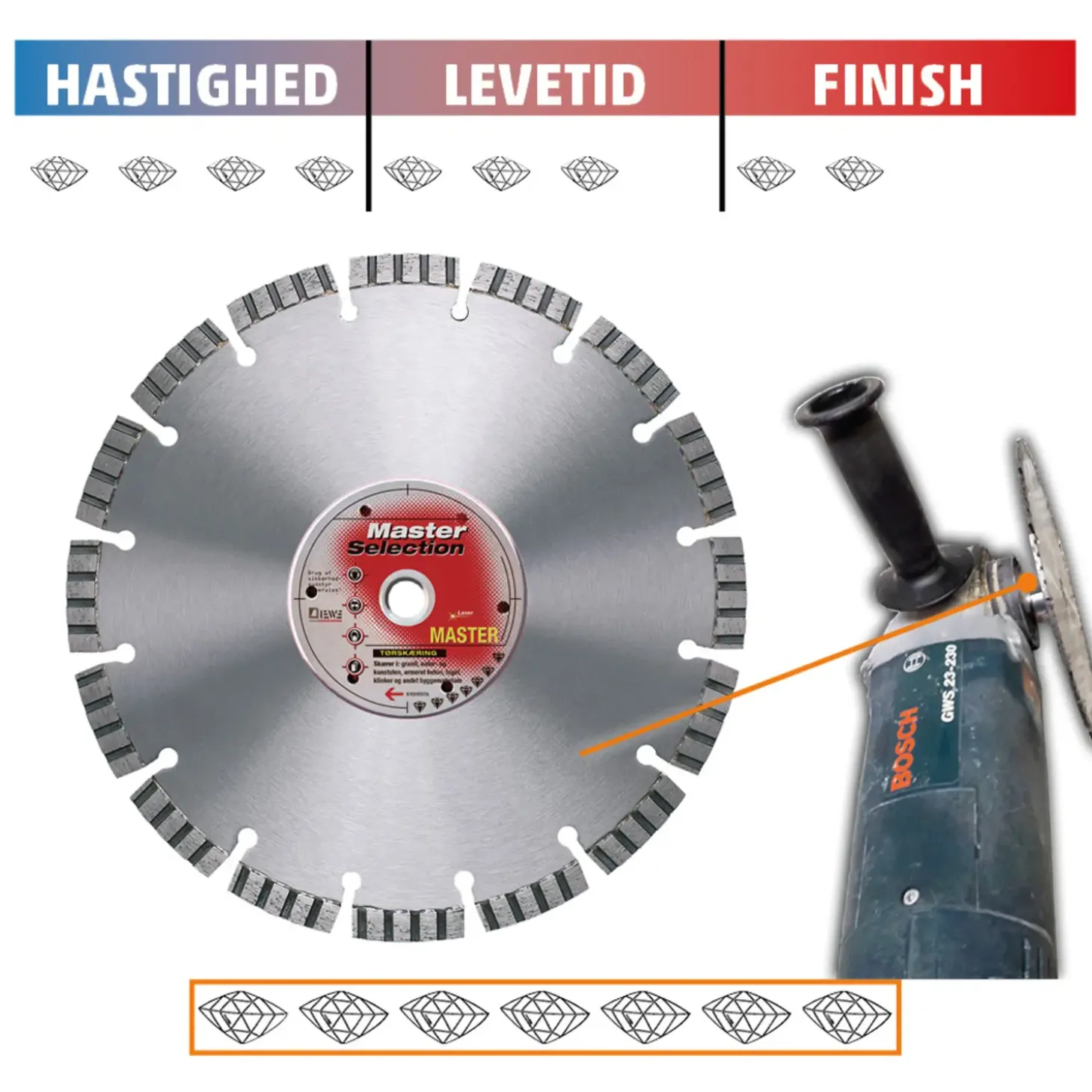 Diamantklinge FLANCHE, kan skære plant med gulv og væg. Diamantklinge med 10 mm aggressive lasersvejste segmenter, skærer i granit, natur- og kunststen, armeret beton, tegl, klinker og andet byggemateriale