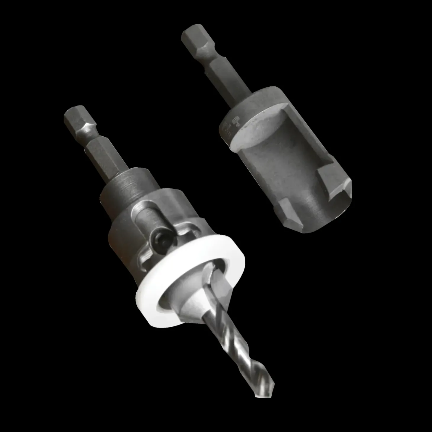 Propbor og forsænkersæt fra DVA. Forsænker er med hårdmetal-skær og dybde stop med beskyttende nylonring samt propbor af hærdet stål.