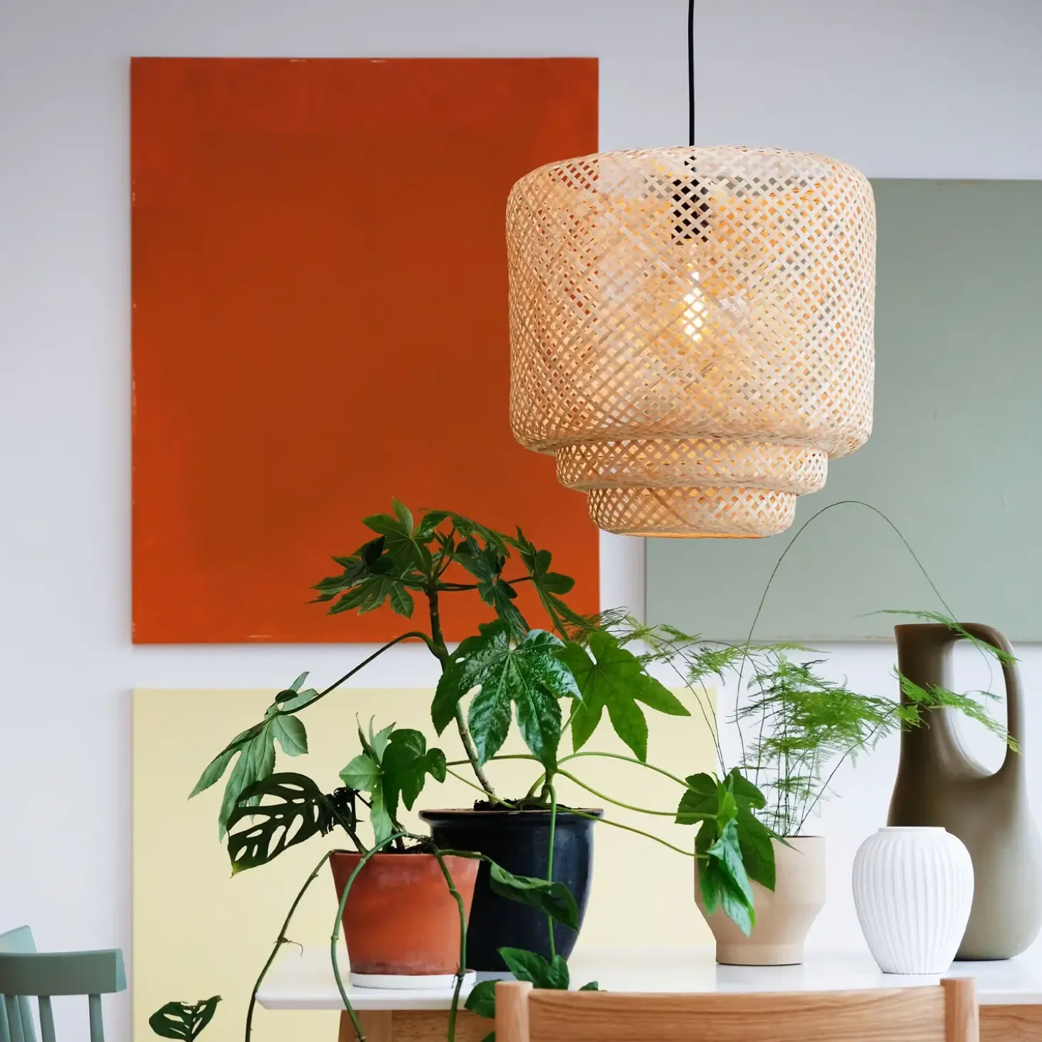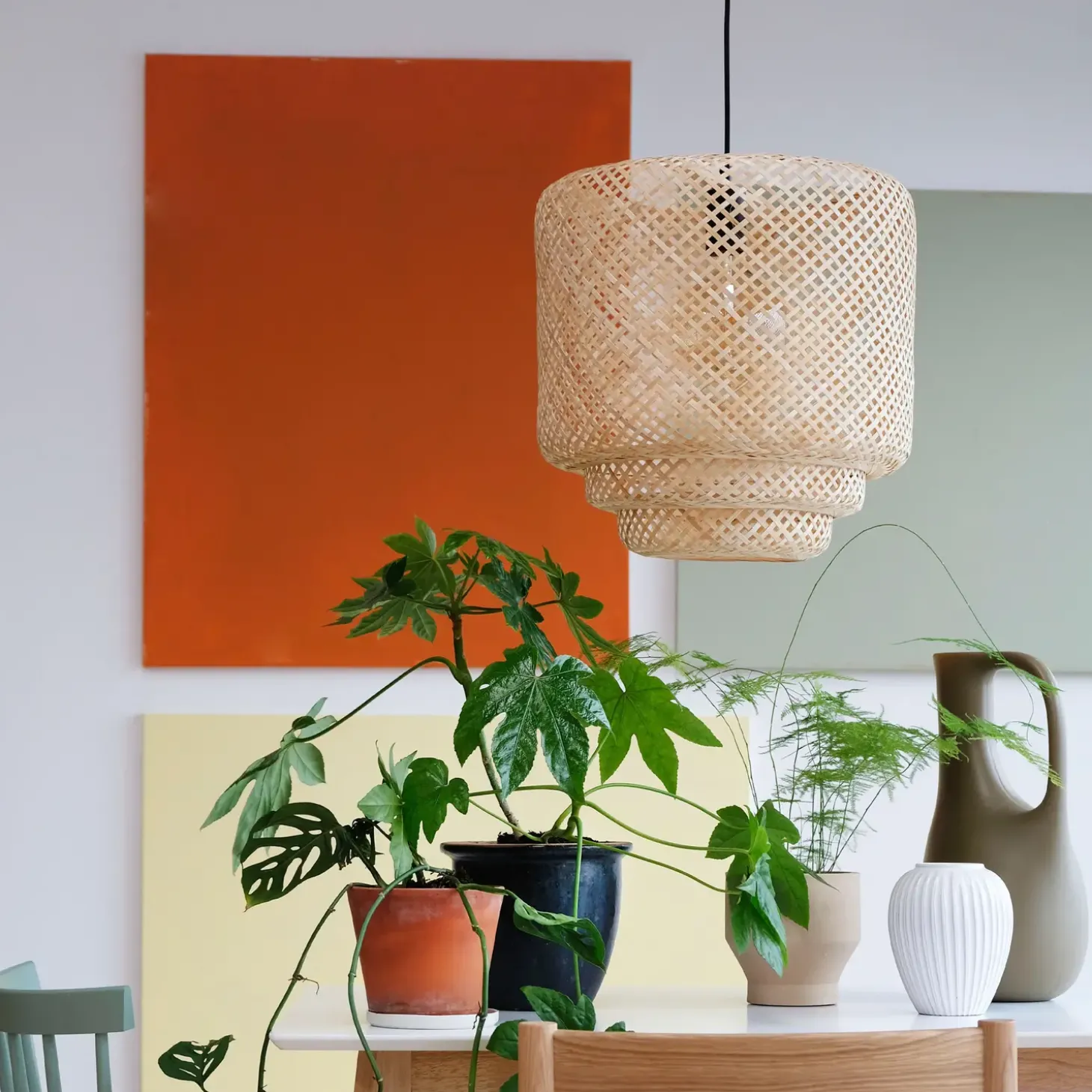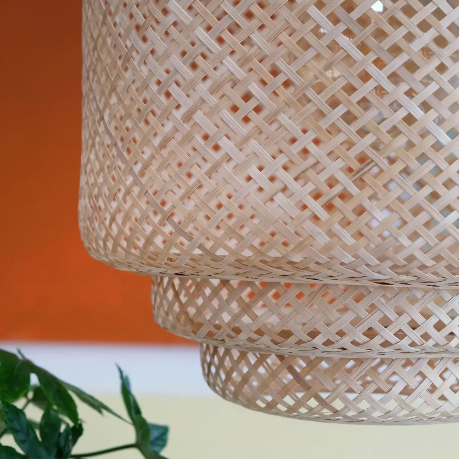 BOOM pendel består af tre skærme, hvor de 2 nederste skærme foldes ud, så de sidder som en enhed. Pendlen er håndflettet.