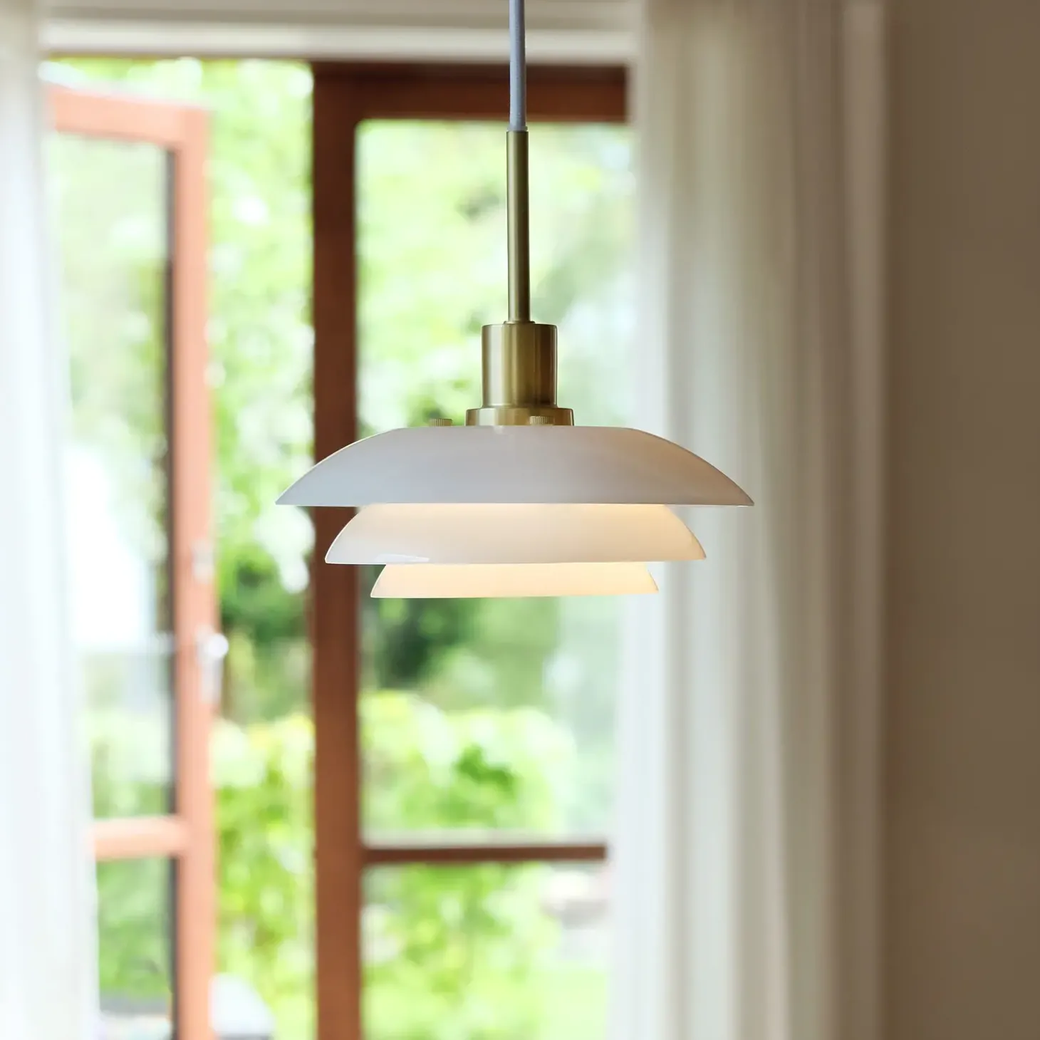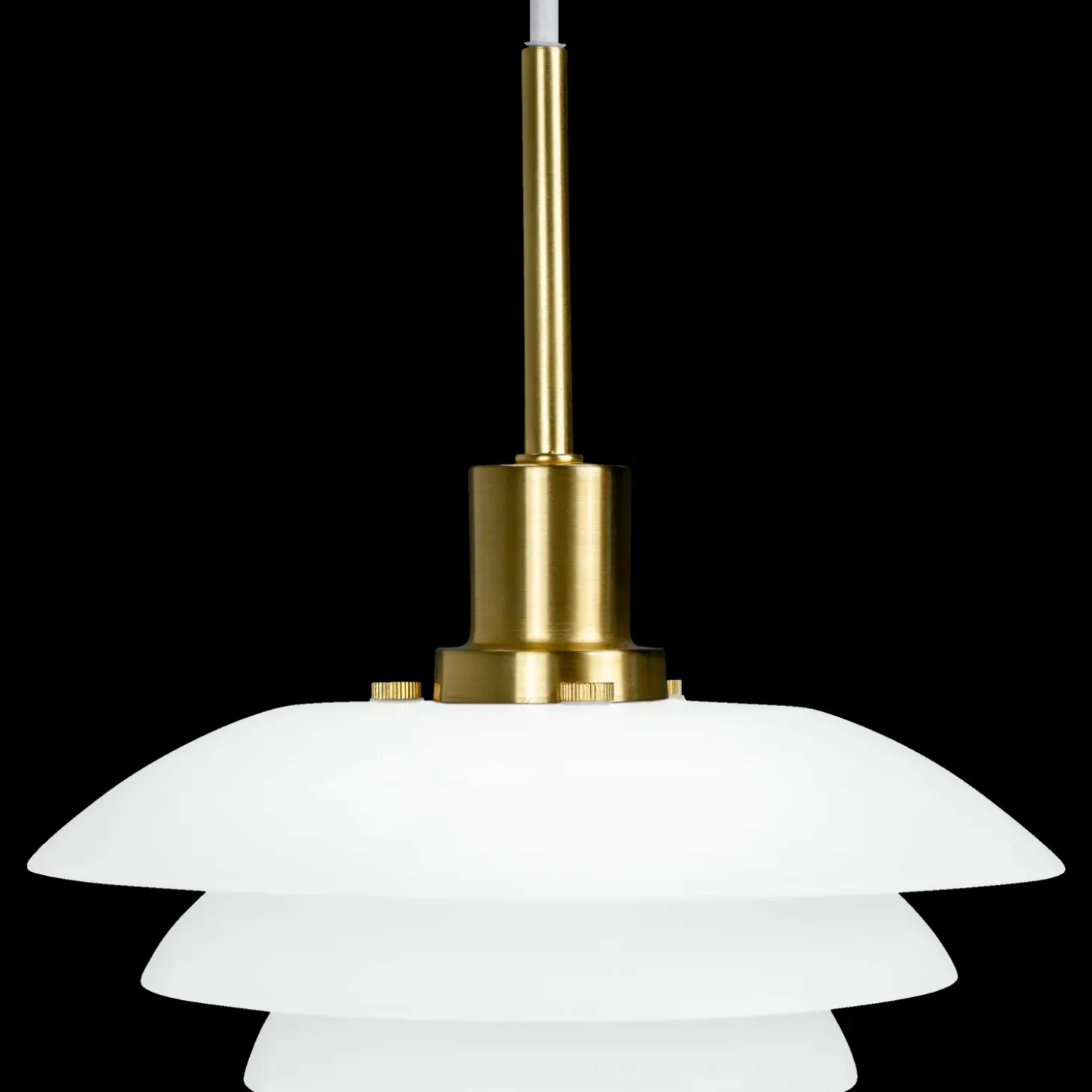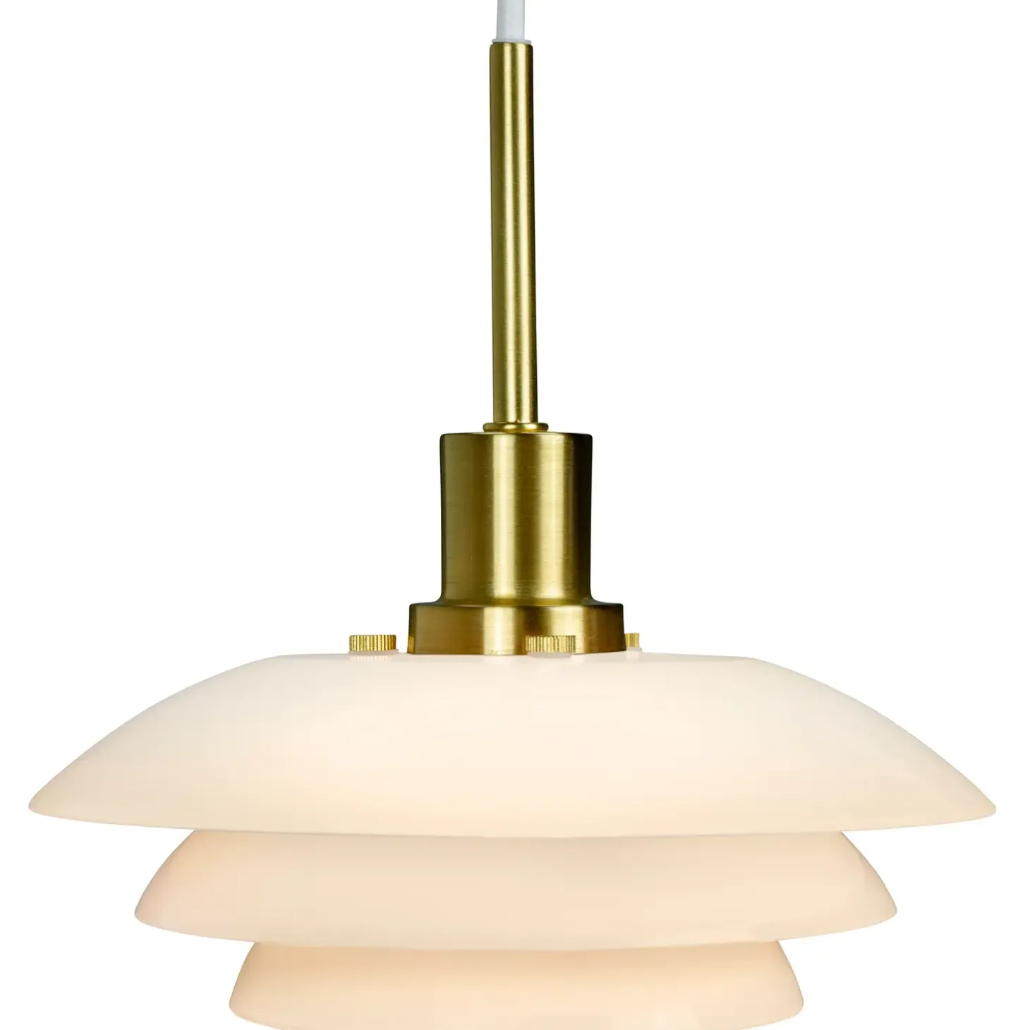 DL20 Opal Pendel med messing base, er en smuk lampe der er meget elegant henover spisebordet eller køkkenbordet. Giver en god effekt med 2 lamper ved siden af hinanden. Lyset ledes smukt gennem de 3 forskellige størrelser skærme, og giver en hyggelig atmosfære i rummet. På grund af skærmenes placering blænder lyset ikke, men skaber i stedet en hyggelig stemning. Pendlen leveres med 3m sort stofledning.