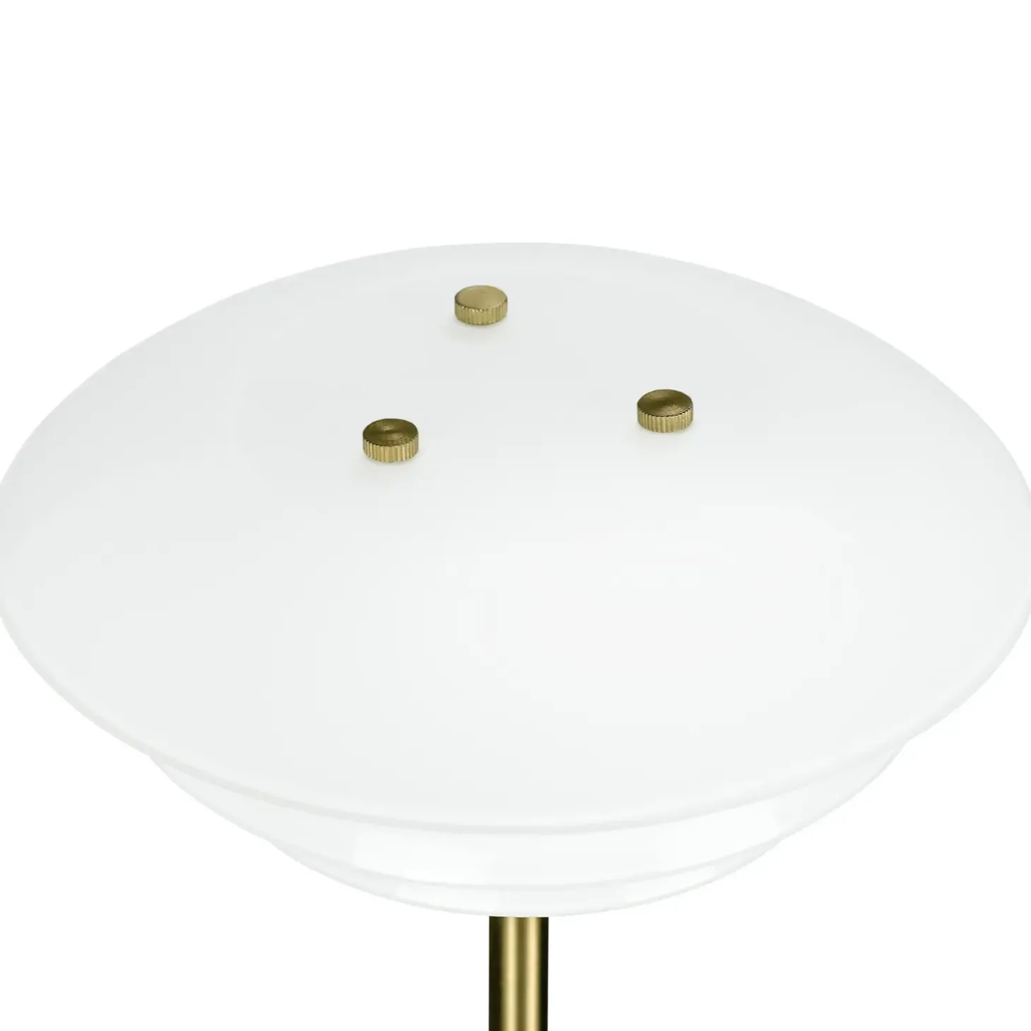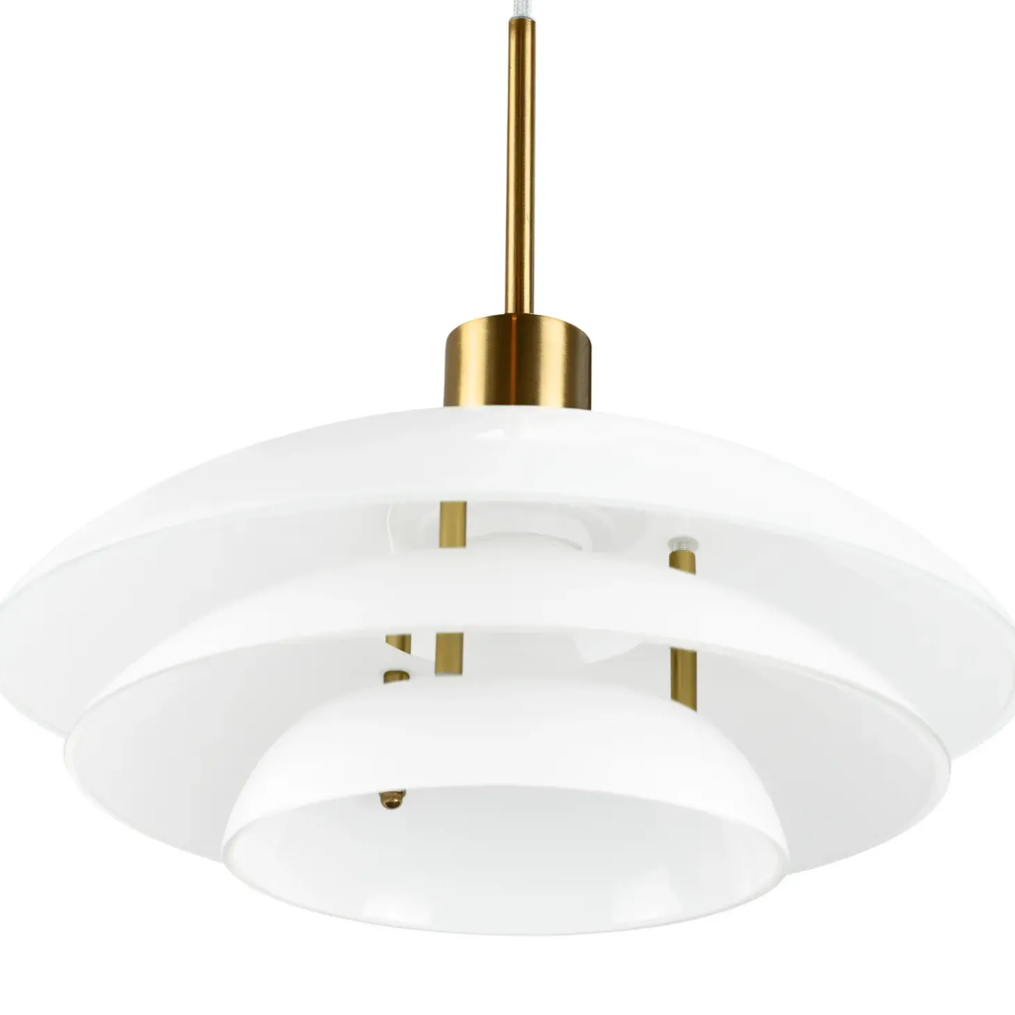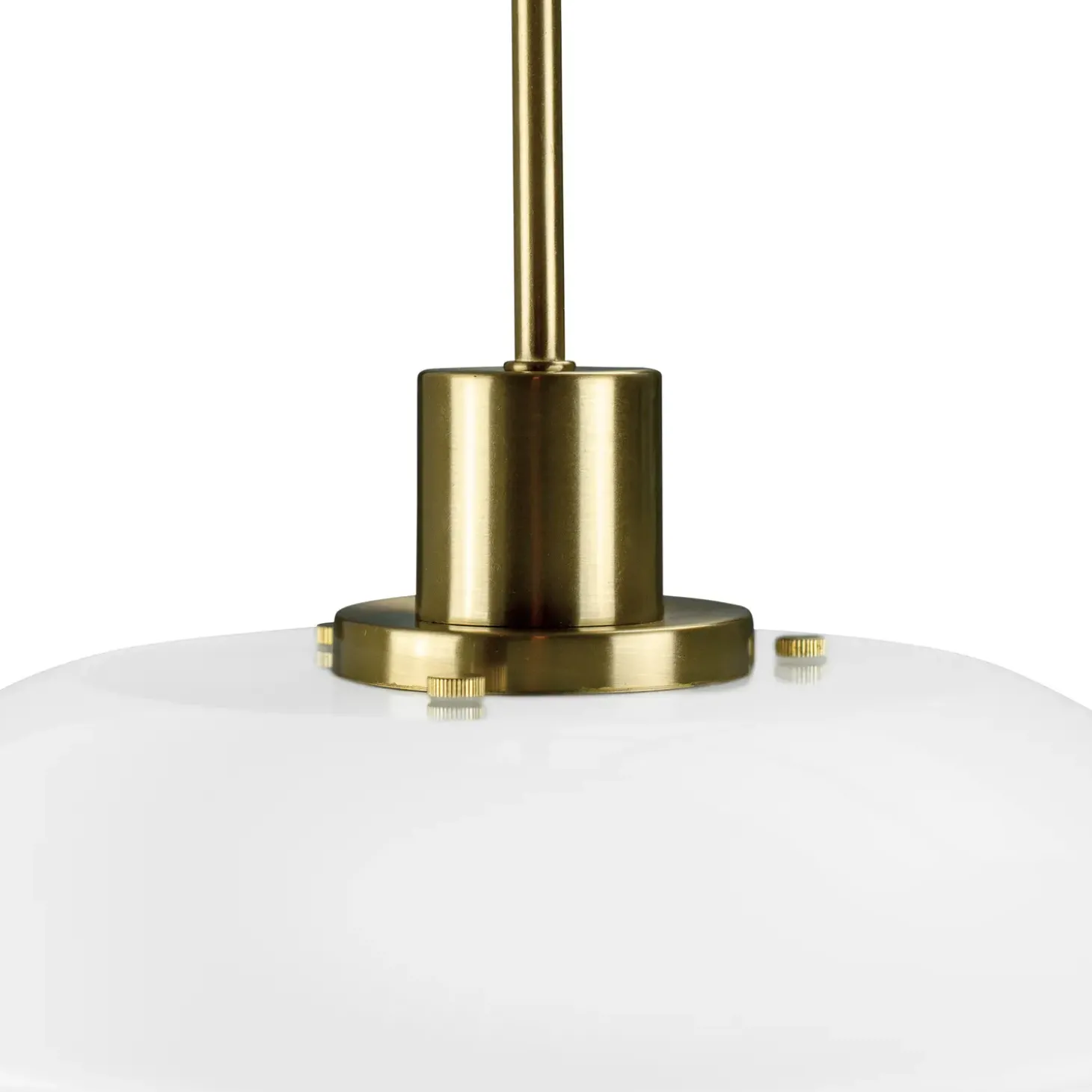 DL20 Opal Pendel med messing base, er en smuk lampe der er meget elegant henover spisebordet eller køkkenbordet. Giver en god effekt med 2 lamper ved siden af hinanden. Lyset ledes smukt gennem de 3 forskellige størrelser skærme, og giver en hyggelig atmosfære i rummet. På grund af skærmenes placering blænder lyset ikke, men skaber i stedet en hyggelig stemning. Pendlen leveres med 3m sort stofledning.