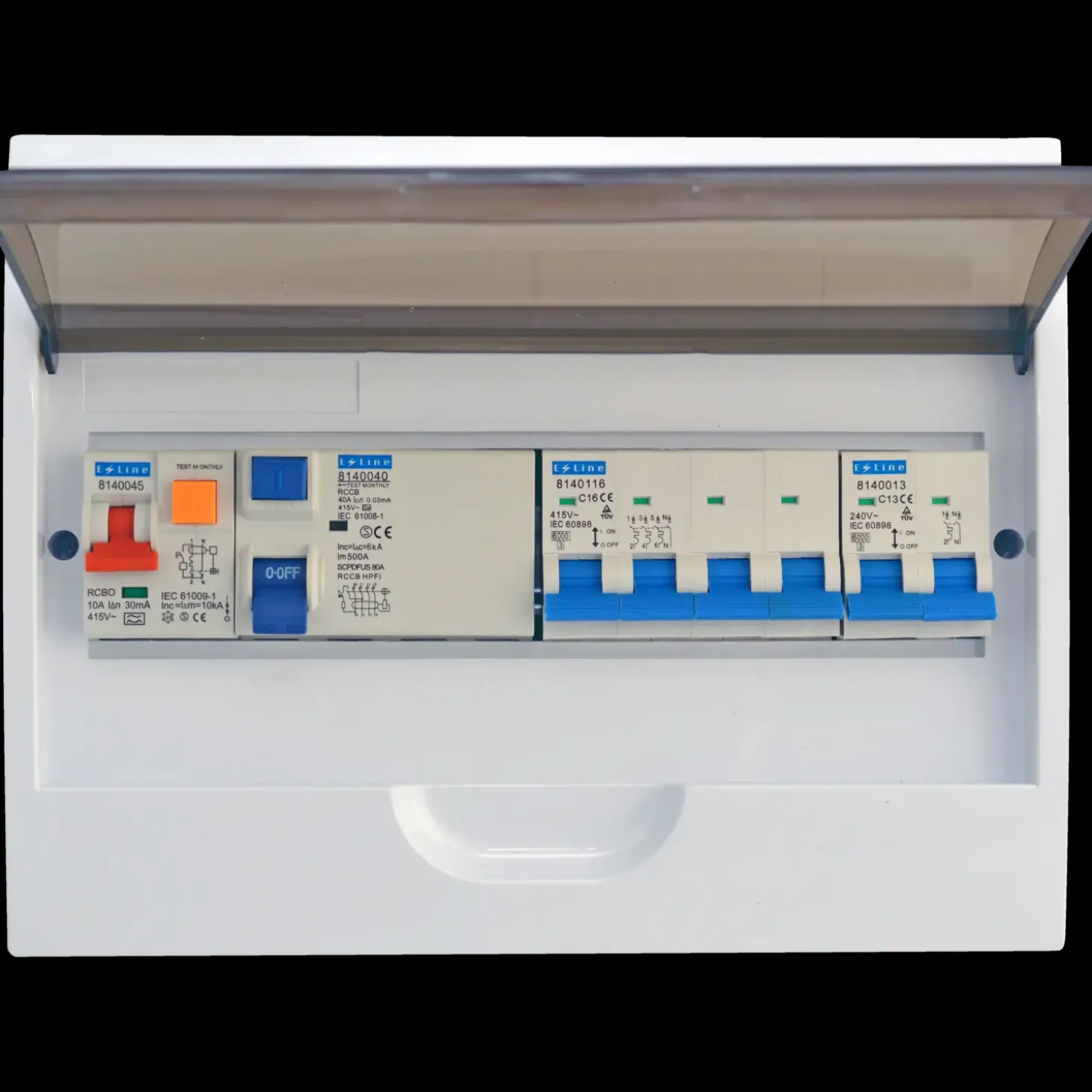 Indeholder 1 stk. HPFI 40A, 1 STK. kombirelæ 10A, 1 STK. 16A 3P+N, 2 STK. 13A 1P+N. med låg