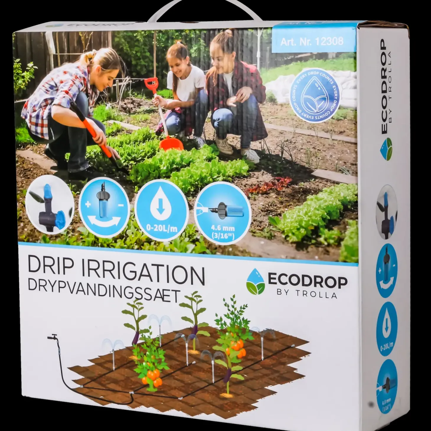 Denne pakke indeholder 5 sprinkler-dyser med forlængere, som vander ensartet eller individuelt, hvilket indstilles ved at dreje på dysehovedet enkeltvist. I alt er der 15 meters Ø13mm slange, som kan fordeles via medfølgende X-, L-stykker. Slangerne kan afkortes efter behov. Systemet kan sprøjte fra 0-20 liter i minuttet, og der medfølger små pløkker til opsætningen. Sættet kan udvides og benyttes i forbindelse med alle andre typer af sæt fra EcoDrop.
