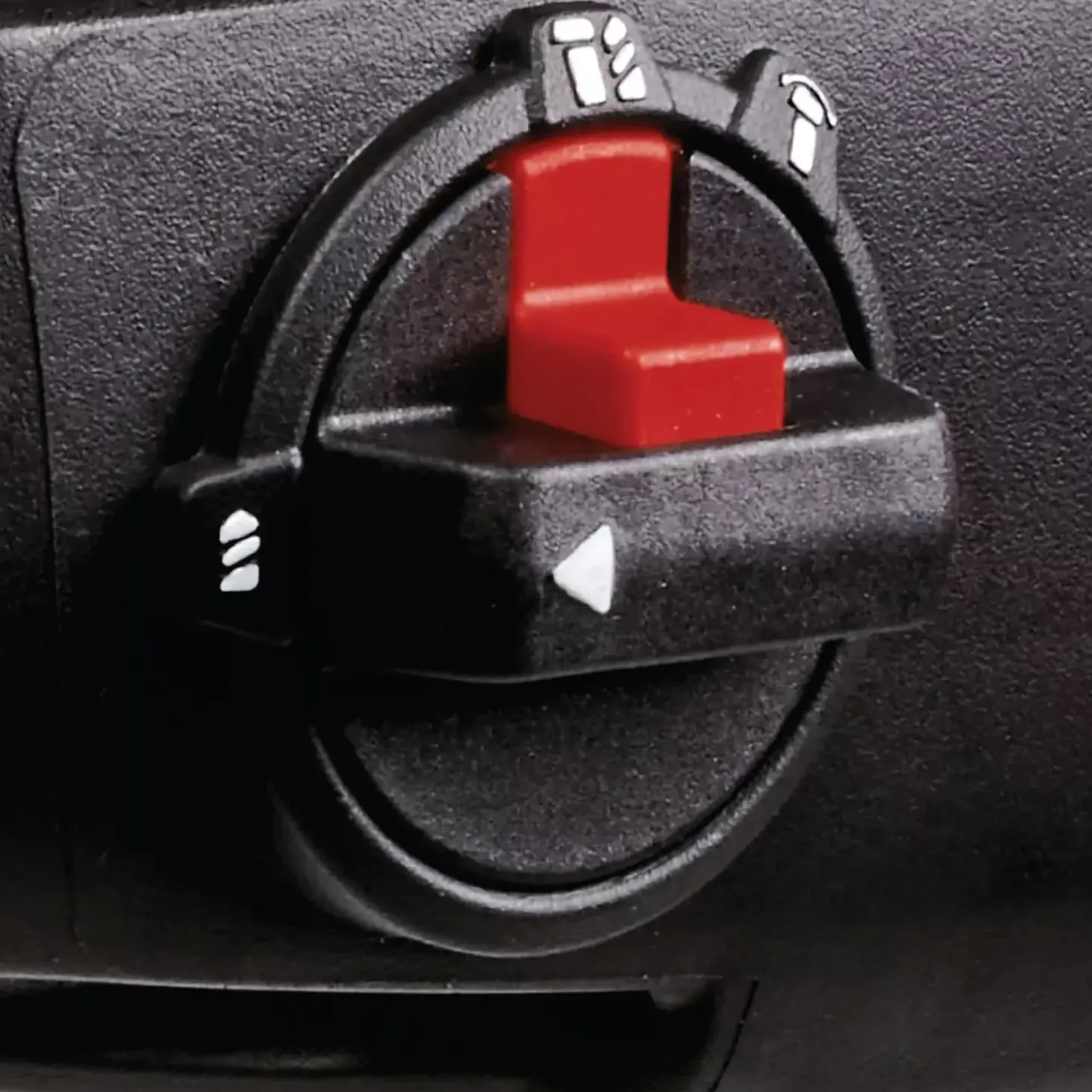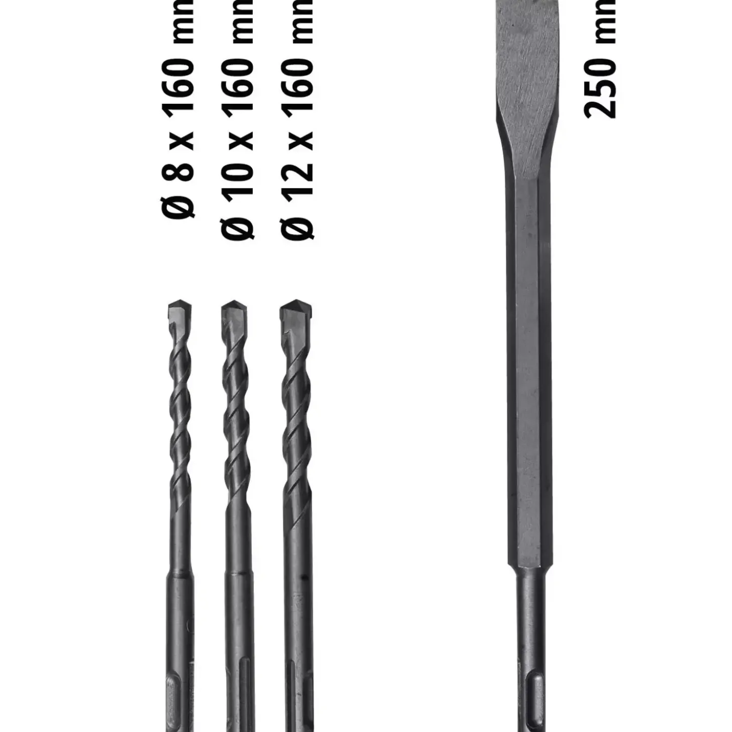 Positionskontakten er impulsgiver for alle funktioner, det pneumatiske slagværk giver en god fremdrift. Låsen til kontinuerlig drift letter arbejdet, den robuste SDS-plus-værktøjsholder er forsynet med halvautomatik, den elektroniske omdrejningstalregulering understøtter materiale- og opgavetilpasset arbejde, og dybdestoppet kan indstilles trinløst. Maskinen leveres inkl. 3 bor og fladmejsel i E-Box Basic.