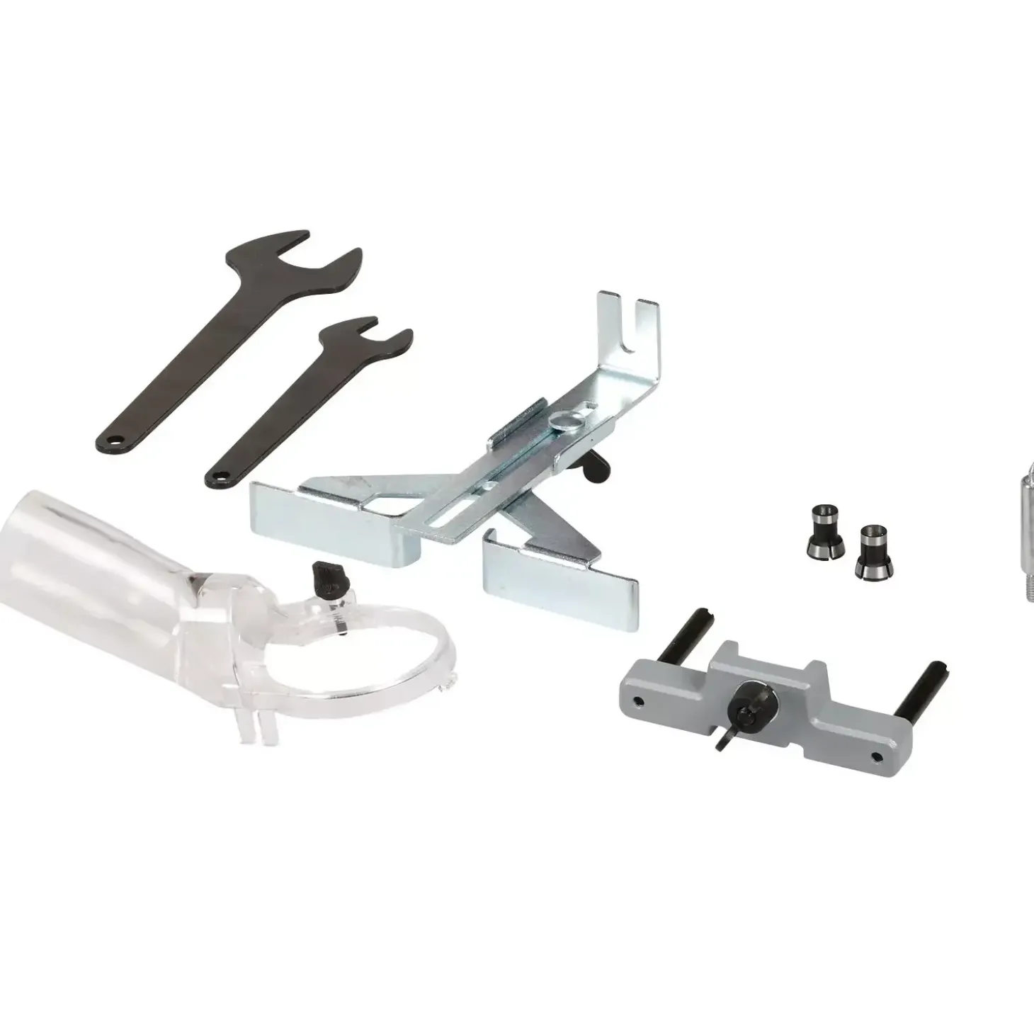 Trinløs indstilling af fræsedybden med finjustering, førsteklasses aluminiumsudførelse, tohåndsgreb og andre funktioner muliggør et præcist arbejde. Udstyret med spændetænger (6 og 8 mm) til diverse fræsejern muliggør spindellåsen et enkelt værktøjsskift.