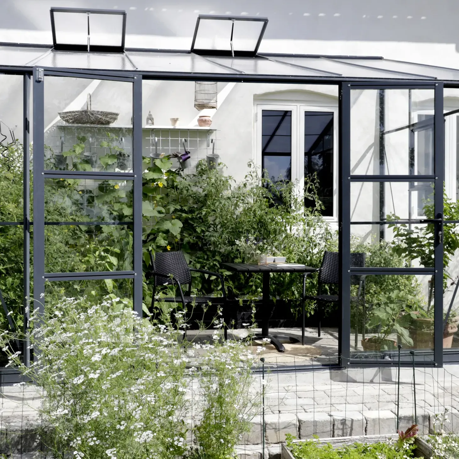 Elmholm Exclusive drivhus er designet med 4 vinduer, der på varme sommerdage sikrer at planterne får den rette ventilation. Du kan tilmed købe en automatisk vinduesåbner, så du undgår at planterne overophedes. Derudover er drivhuset fremstillet med en hængslet dobbeltdør, der sikrer en nem adgang. Drivhuset kommer med antracitprofiler af kraftigt aluminium, 4 mm hærdet glas i siderne og 10 mm polycarbonat plader i taget. Gode gedigne materialer af kraftig kvalitet. Ligeledes kommer drivhuset med aluminiumsfundament på 10 cm i højden med målene B: 4392 x D: 2931 mm.