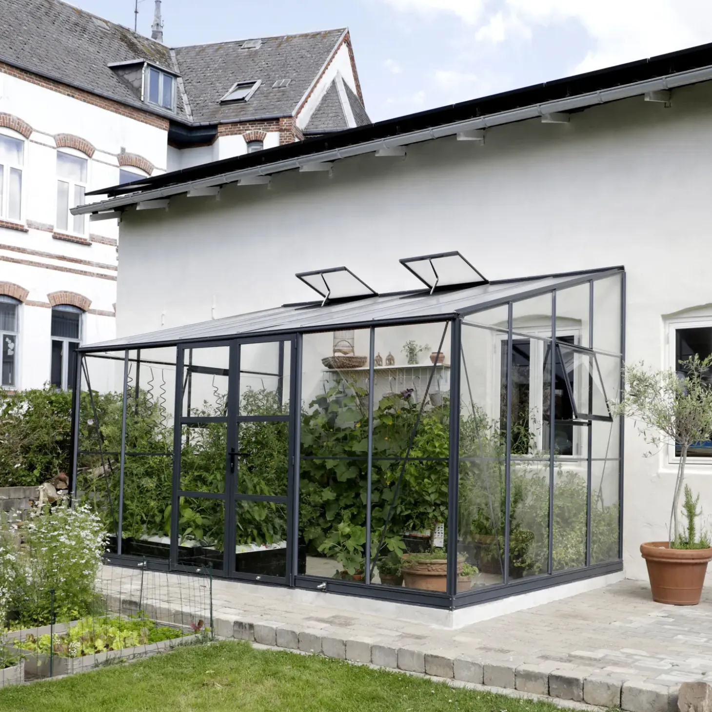 - Udnytter varmen fra husmuren, så temperaturen i drivhuset bliver mere stabil, og planterne får et bedre klima