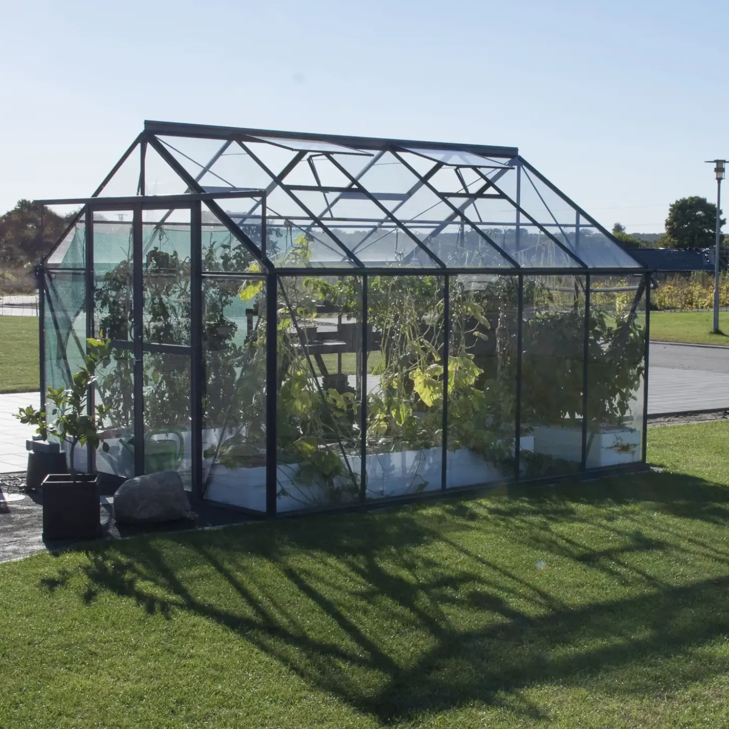 Drivhuset her kommer med antracitprofiler i aluminium og 3 mm hærdet glas i hele baner, der giver et fint og uforstyrret udsyn uden glassamlinger. Derudover leveres Elmholm Standard drivhuset med galvaniseret stålfundament B272,4 x L355,5, hvilket gør det 12 cm højere.