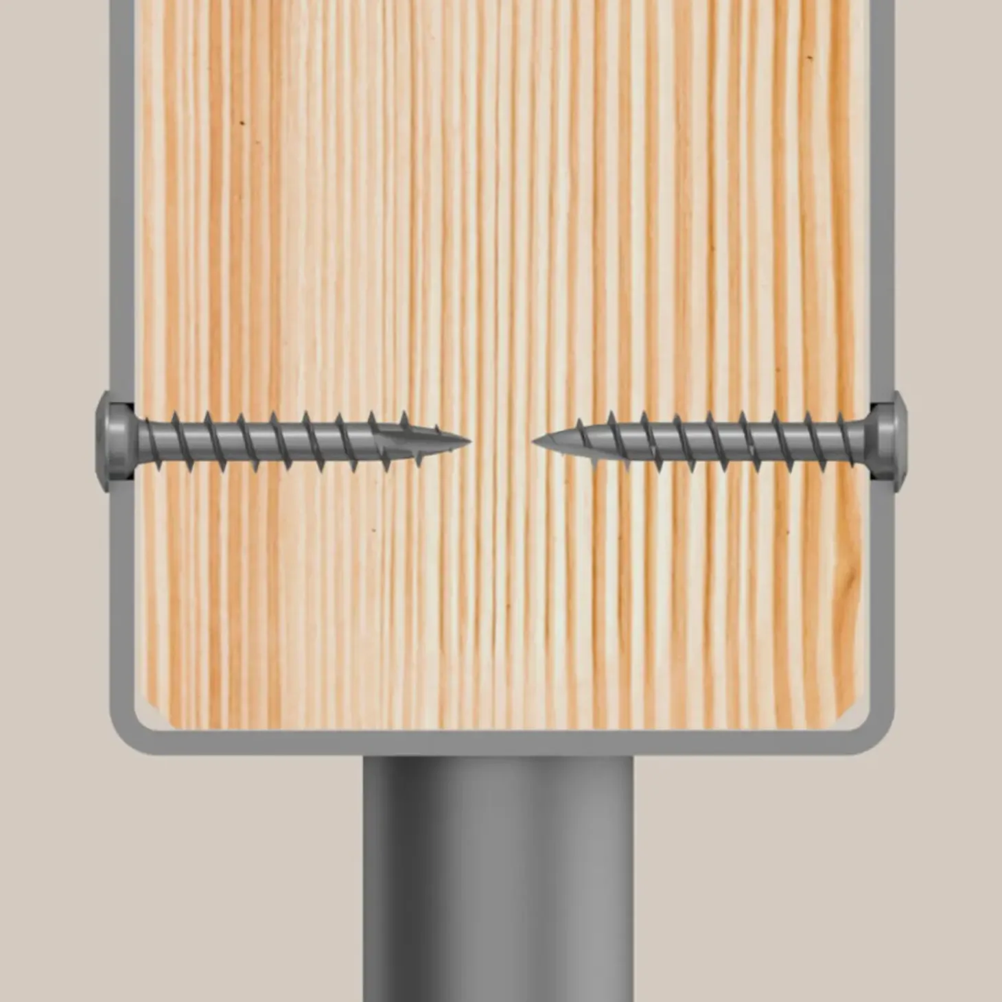- Den specielle form på skruehovedet sikrer at skruen låser sig fast med stolpefoden.