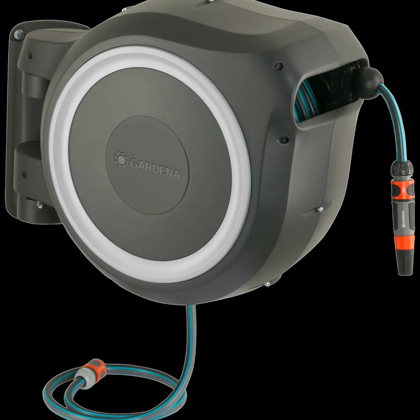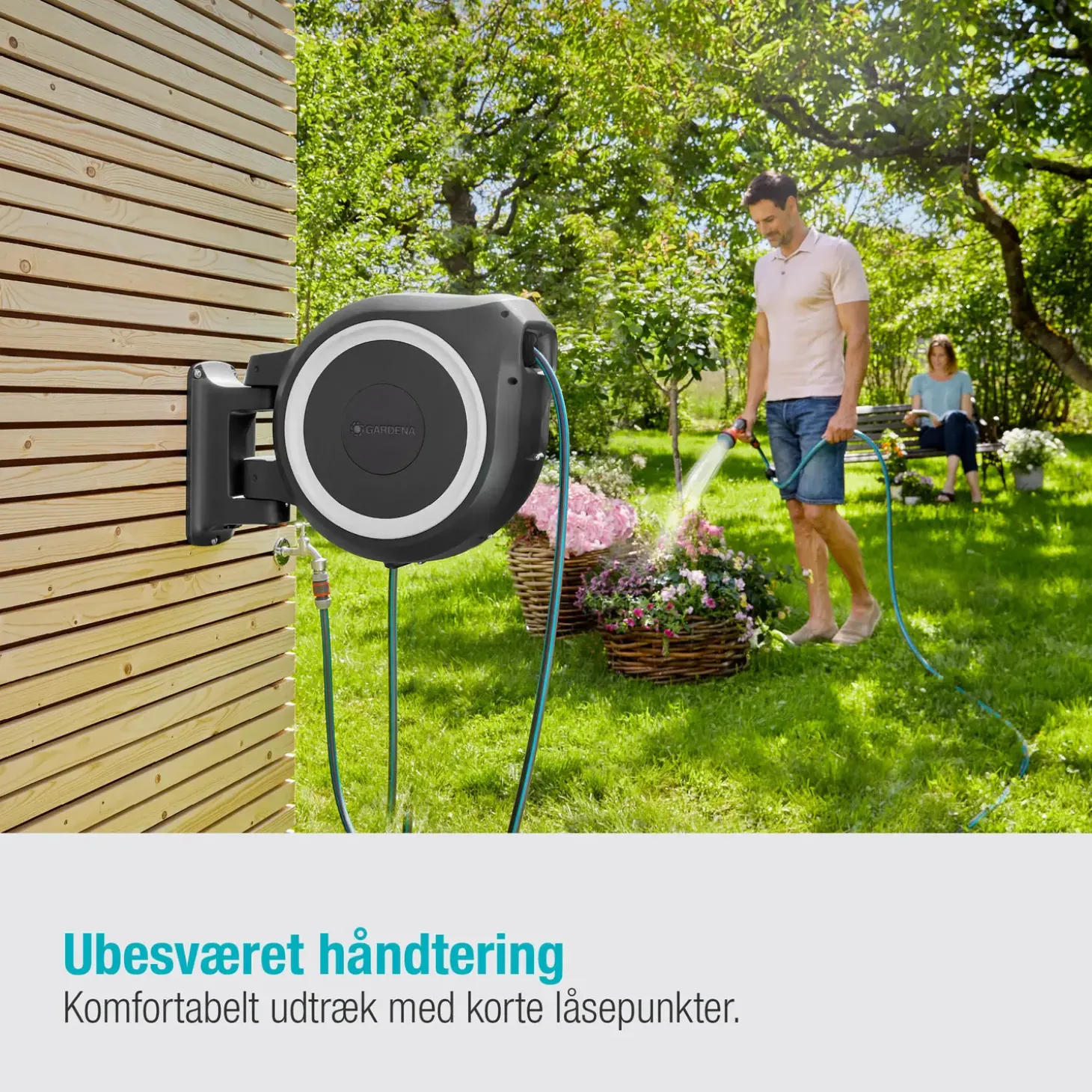 Den vægmonterede slangeboks Gardena RollUp M/L 25 med automatisk oprul gør det supernemt og bekvemt at vande. Slangen kan nemt og bekvemt trækkes ud med et minimum af anstrengelse og stoppes med korte intervaller à maks. 50 cm. Stålfjederen, som er tilpasset perfekt til slangens længde, sikrer et ensartet og kraftfuldt tilbagetræk. Det integrerede slangestyr forhindrer snoning og sammenfiltring af slangen.