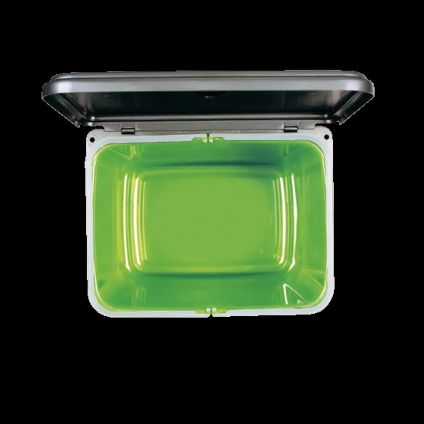 Praktisk affaldsbeholder til montering på inderside af køkkenskabslågen eller i bryggers inventar. Beholderens låg åbnes automatisk når køkkenkabet åbnes.