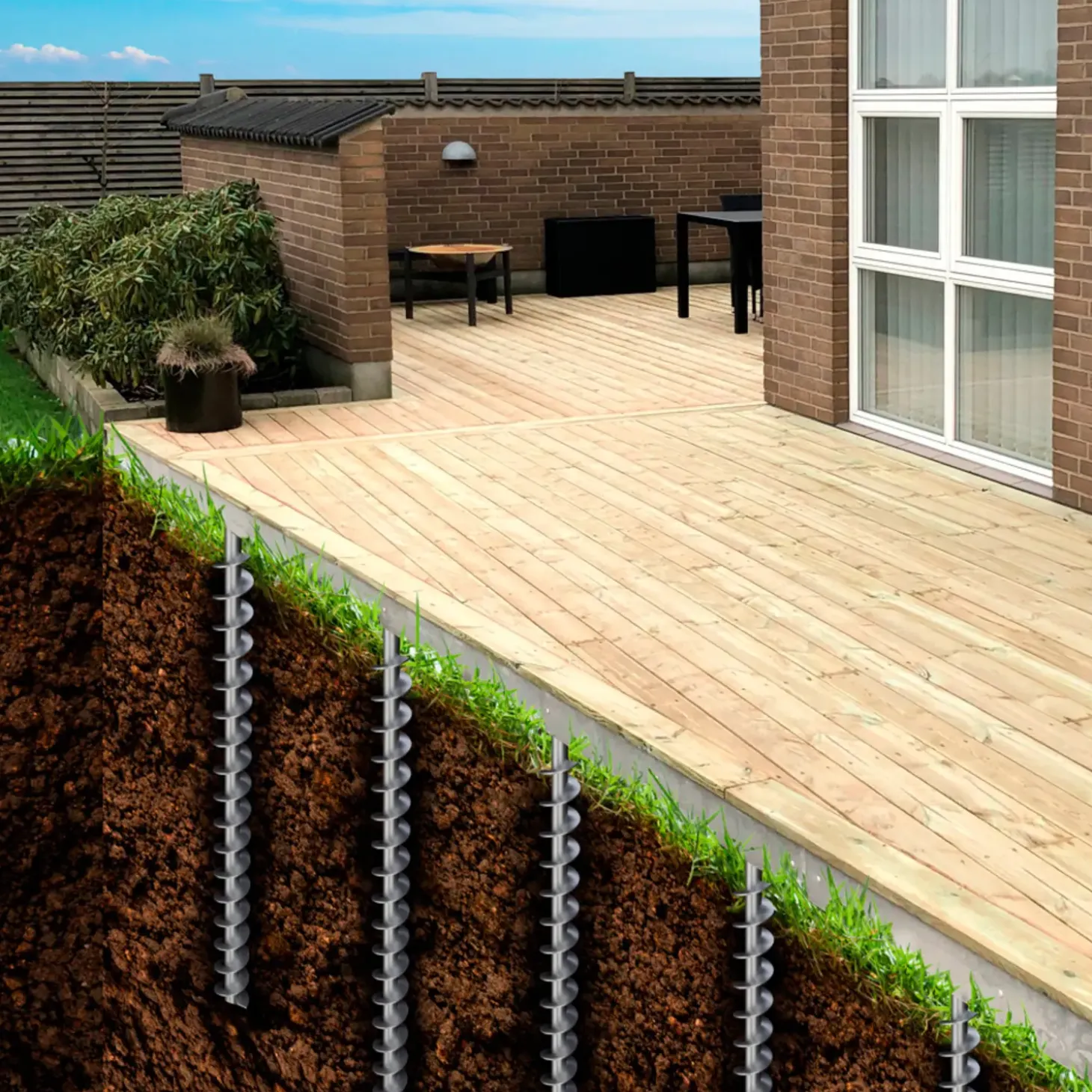Vælg dette fundament til fladt terræn, til projekter som fx træterrasse, gangsti, forankring af store trampoliner mv.