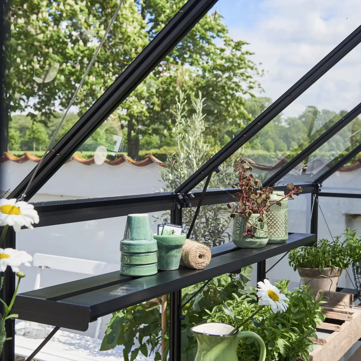 Paktisk hylde til Halls Qube drivhuse. Drivhushylden monteres nemt i drivhusets aluminiumsprofiler.