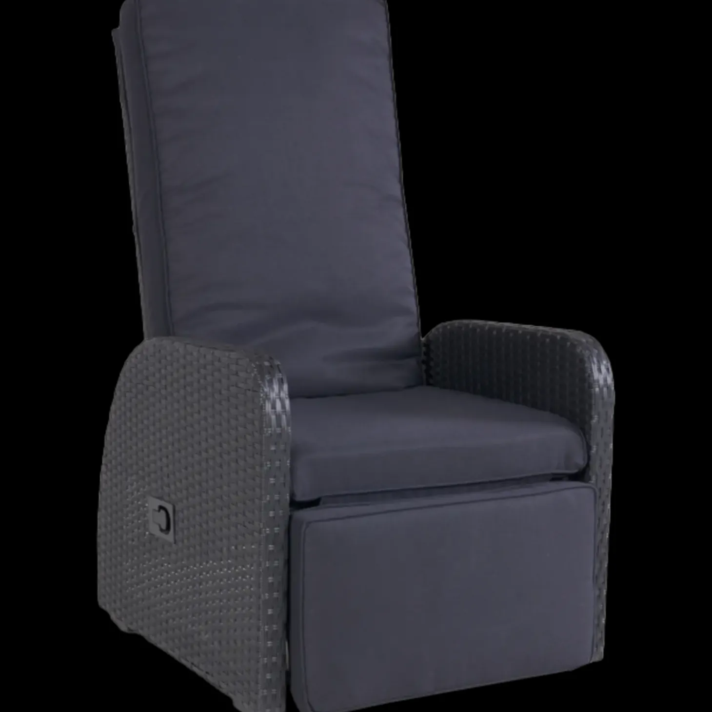 Havestol i robuste materialer med indstillelig ryg for behagelig siddecomfort. Leveres inklusiv vandeafvisende hynderMateriale sort børstet PE-flet samt stel i pulverlakeret stål.