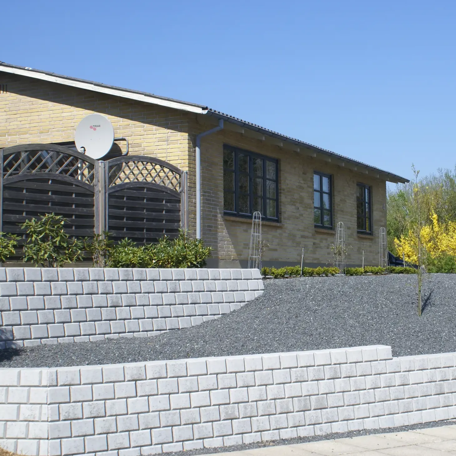 Danblokke med stor affasning, der tilegner muren et flot finish. Danblokken der kan anvendes til høje mure og som giver en enkelt og harmonisk støtte- støjsmurs blok.