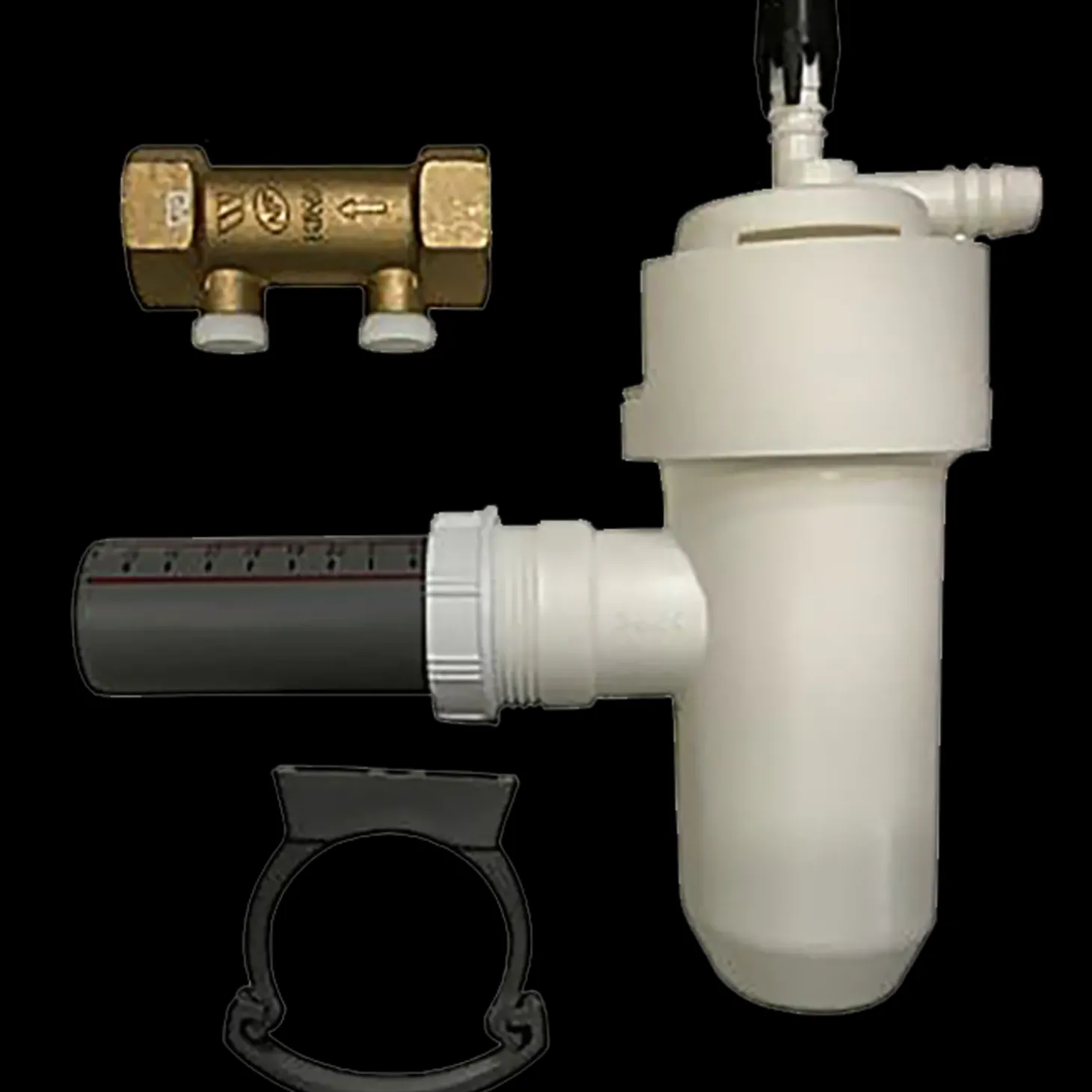 Tilslutnings sæt fra BWT med kontrollerbar kontraventil, samt en vandlås som har studs i toppen og siden til henholdvis overløb samt skylle tilslutning når BWT anlægget har re-genereret og skal skylle det brugte vand ud. Afgang på studsen er 40mm som skal tilsluttes afløb til kloak.