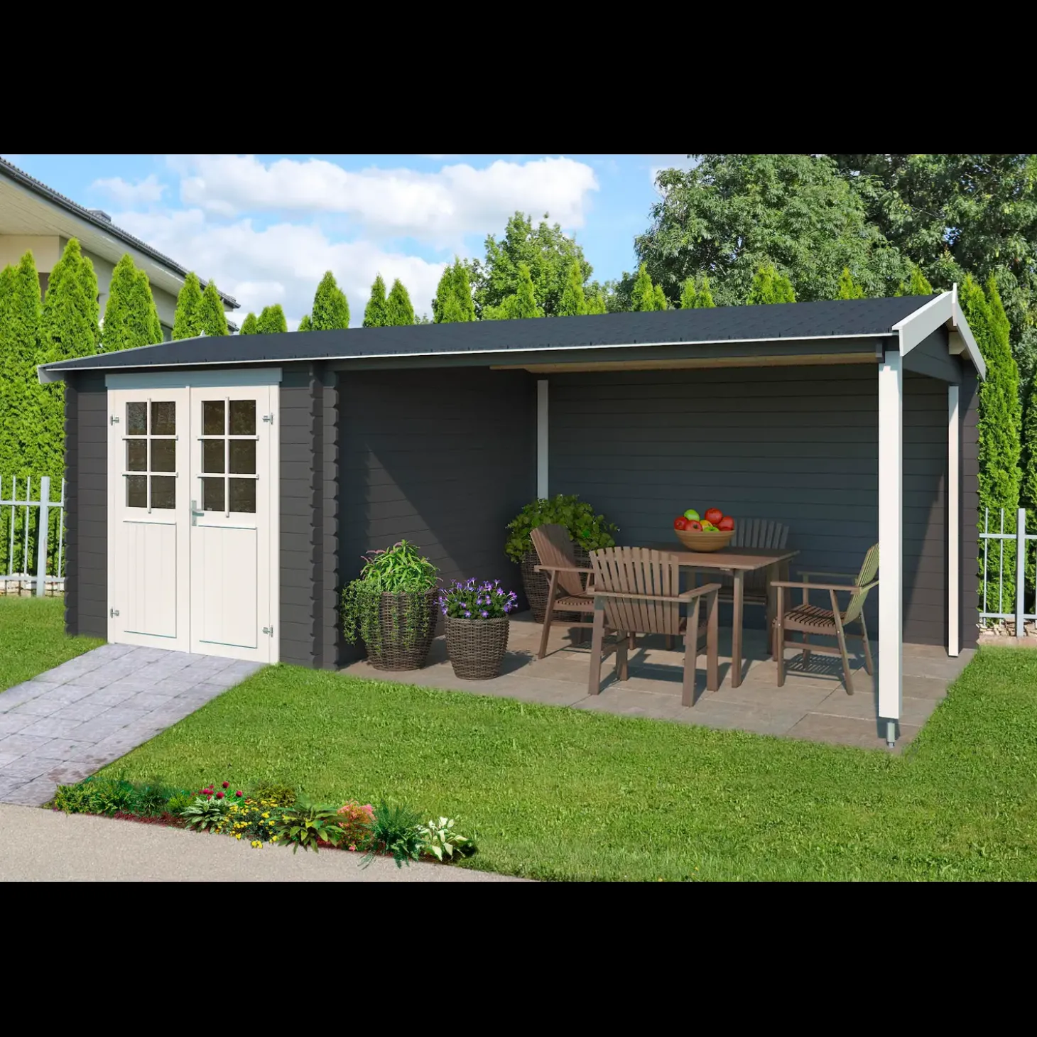 Dette redskabsskur har både en overdækket terrasse og et rum til opbevaring af fx haveredskaber og værktøj.