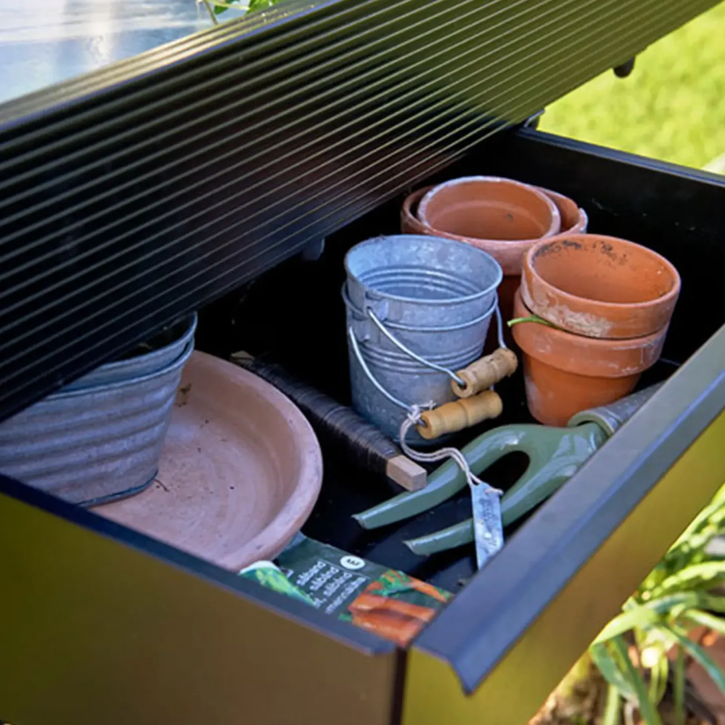 Under bordet er der monteret en god skuffe til opbevaring af småredskaber, frø og lignende.