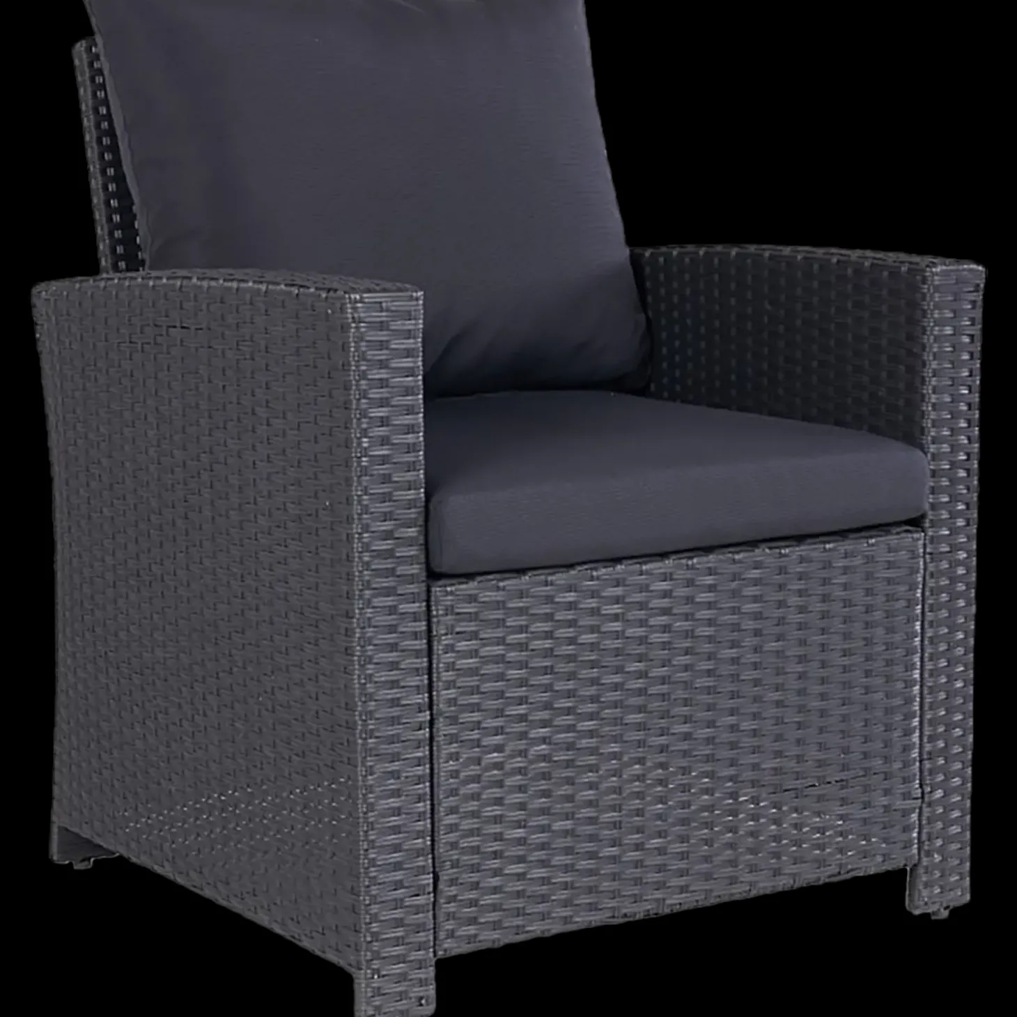 Loungestol i sort PE-flet, som har lang levetid også udendørs og med minimal vedligeholdelse. Inkl. hynder.Ryghøjde 49 cm fra sæde til top af ryglæn.