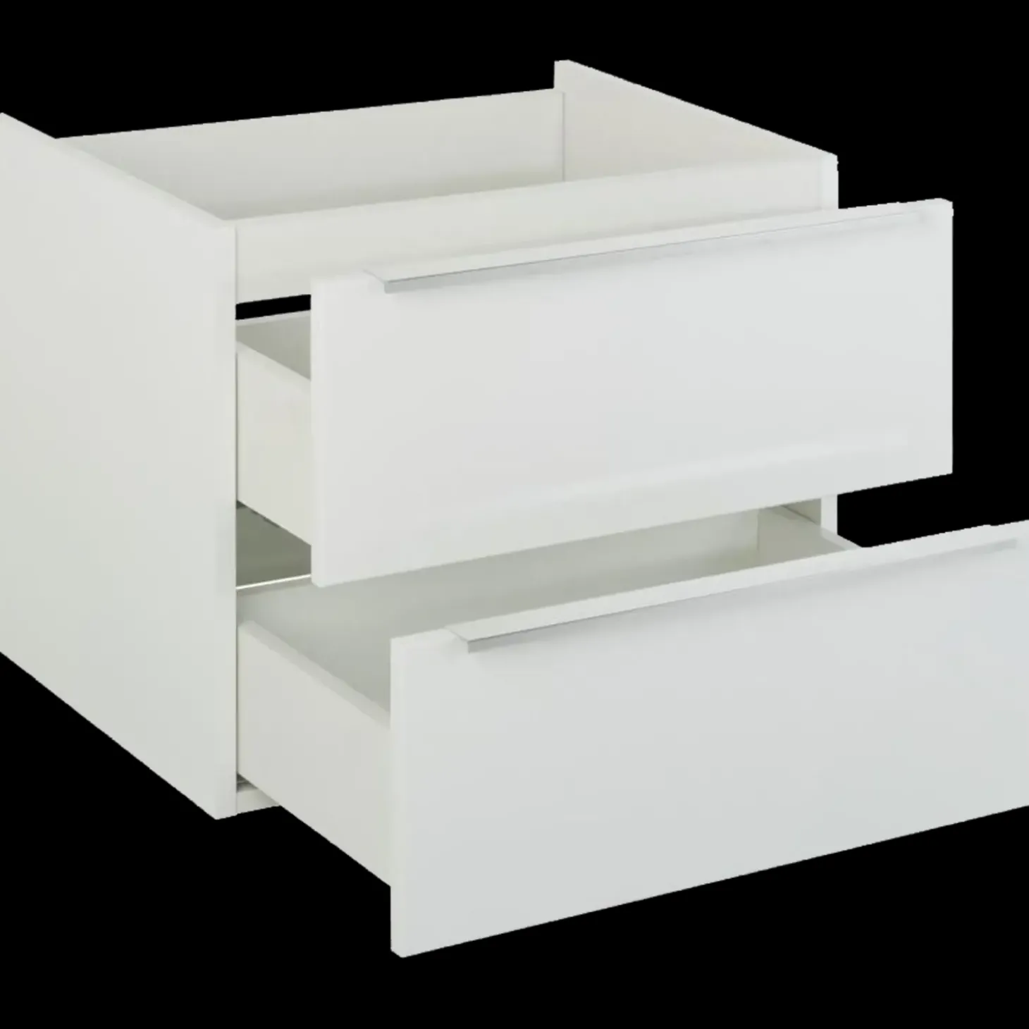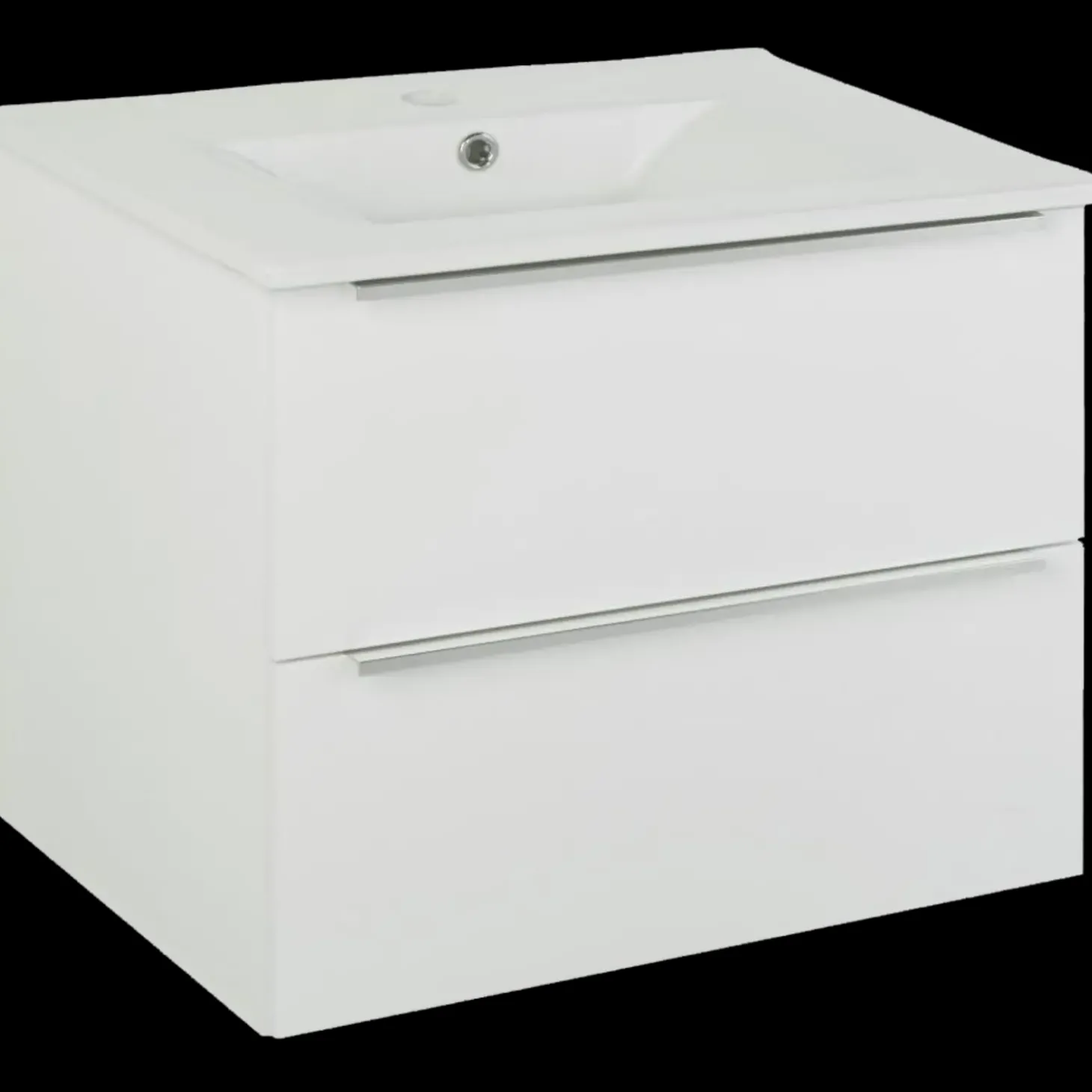 Flot og enkelt Aurum badsæt 60 cm i hvid højglans med porcelænsvask. Badsættet indeholder 2 skuffer med forkromet greb og softclose.