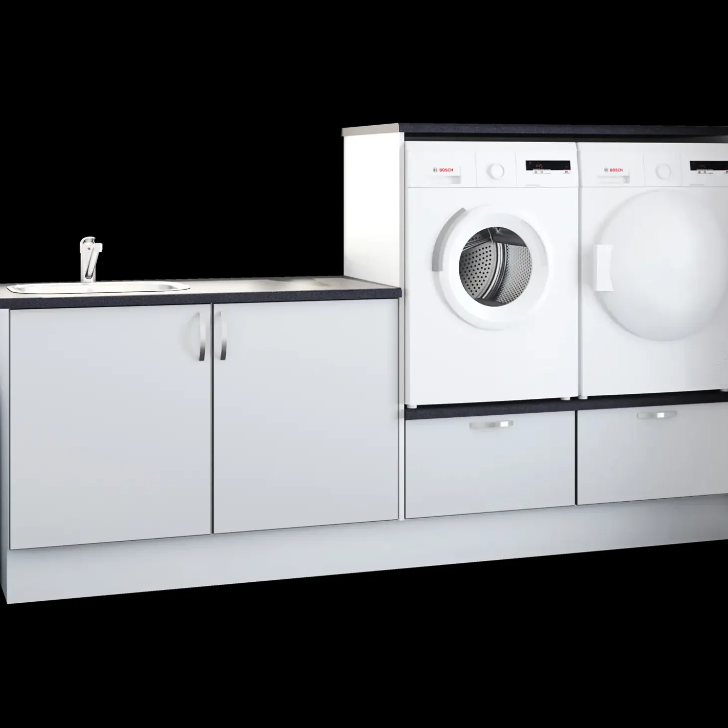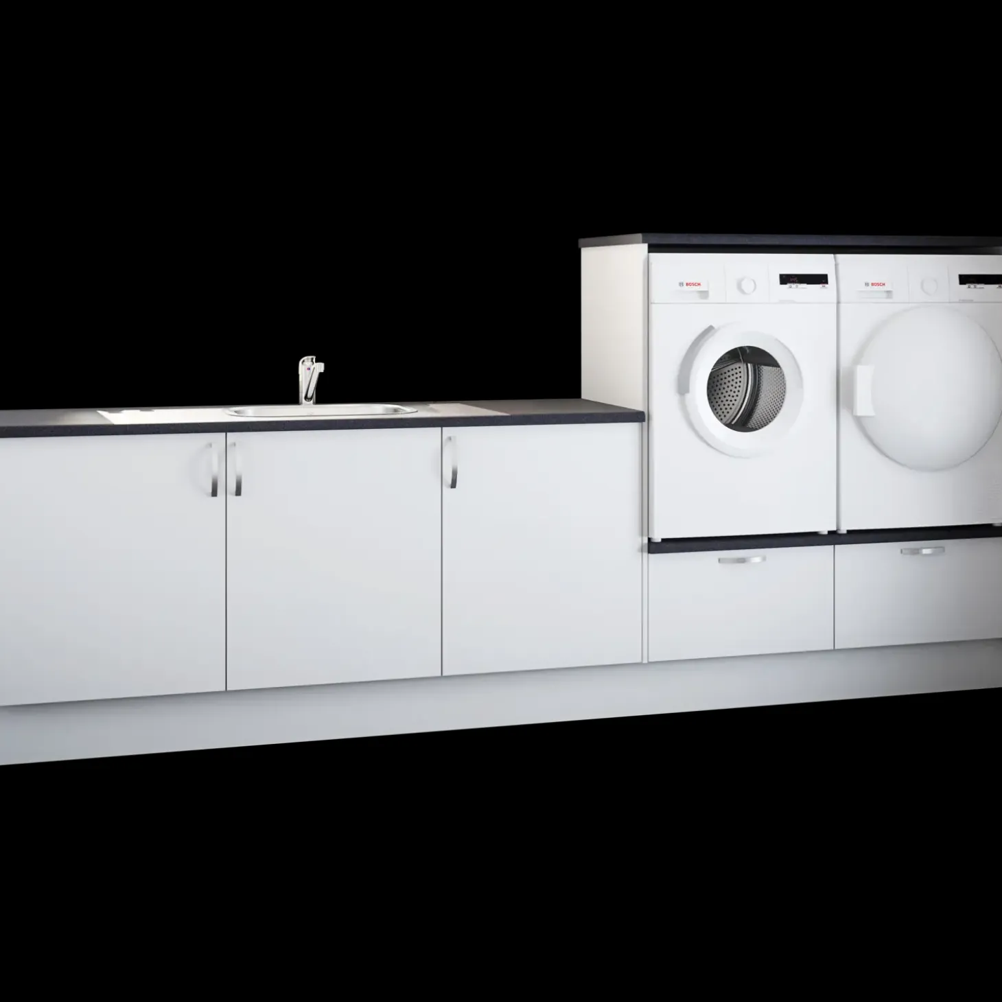 Bryggersskabet er lavet af 100 grams melamin, som er langt højere end den gennemsnitlige standard. Dette giver en slagfast, glat og hård overflade, som er farvebestandig, og meget nem at vedligeholde. Kanten på skabet er lavet af en stødabsorberende 1,0 mm ABS-kant. Alle hængsler og udtræk er med integreret softclose som standard og er af meget høj tysk kvalitet. Skabene er med skjulte samlinger og minifix beslag.