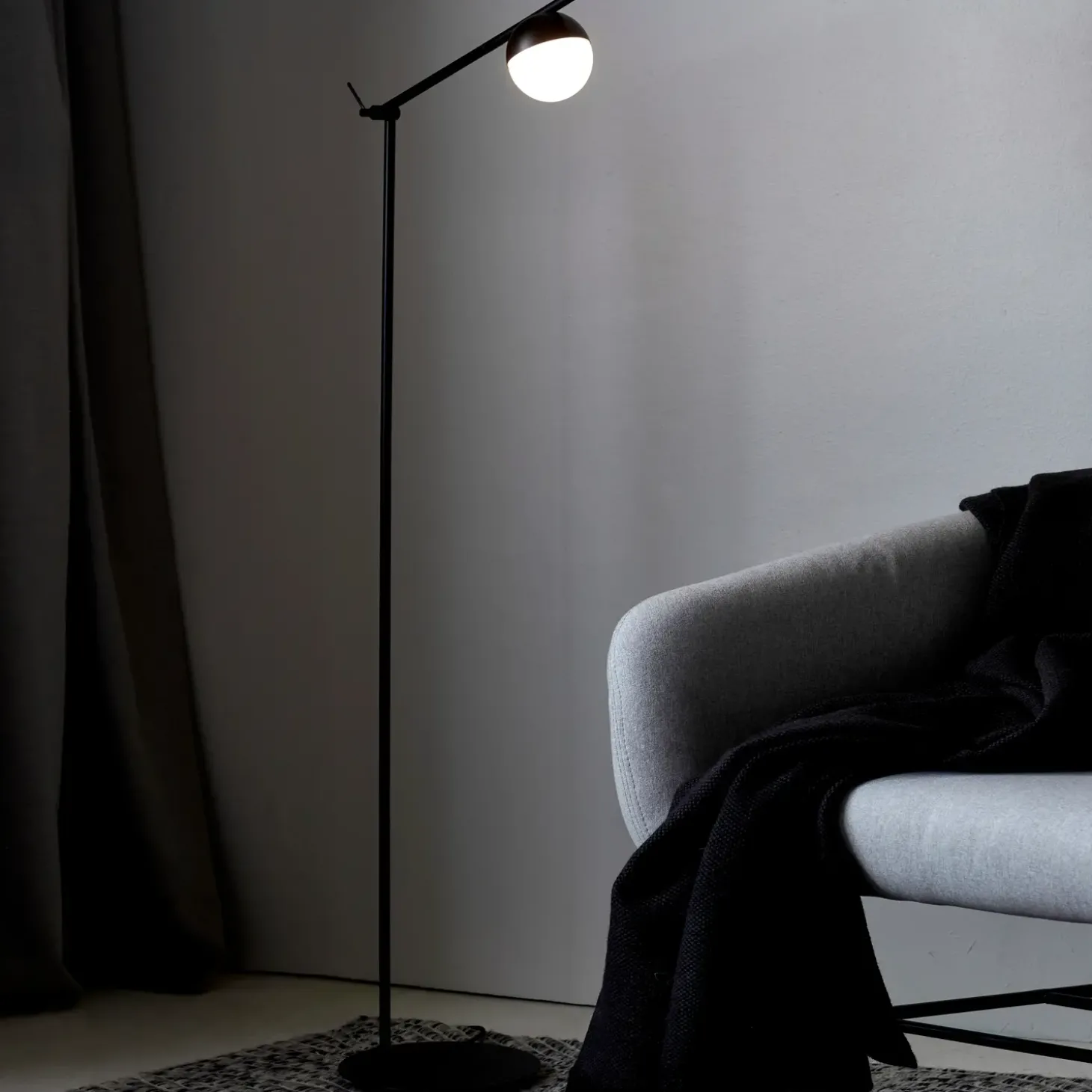 Contina er en moderne gulvlampe i sort mat metal med mange funktioner. Lampehovedet kan drejes til begge sider, og samtidigt kan den øverste del af stellet justeres både op og ned, hvilket giver mange anvendelsesmuligheder.
