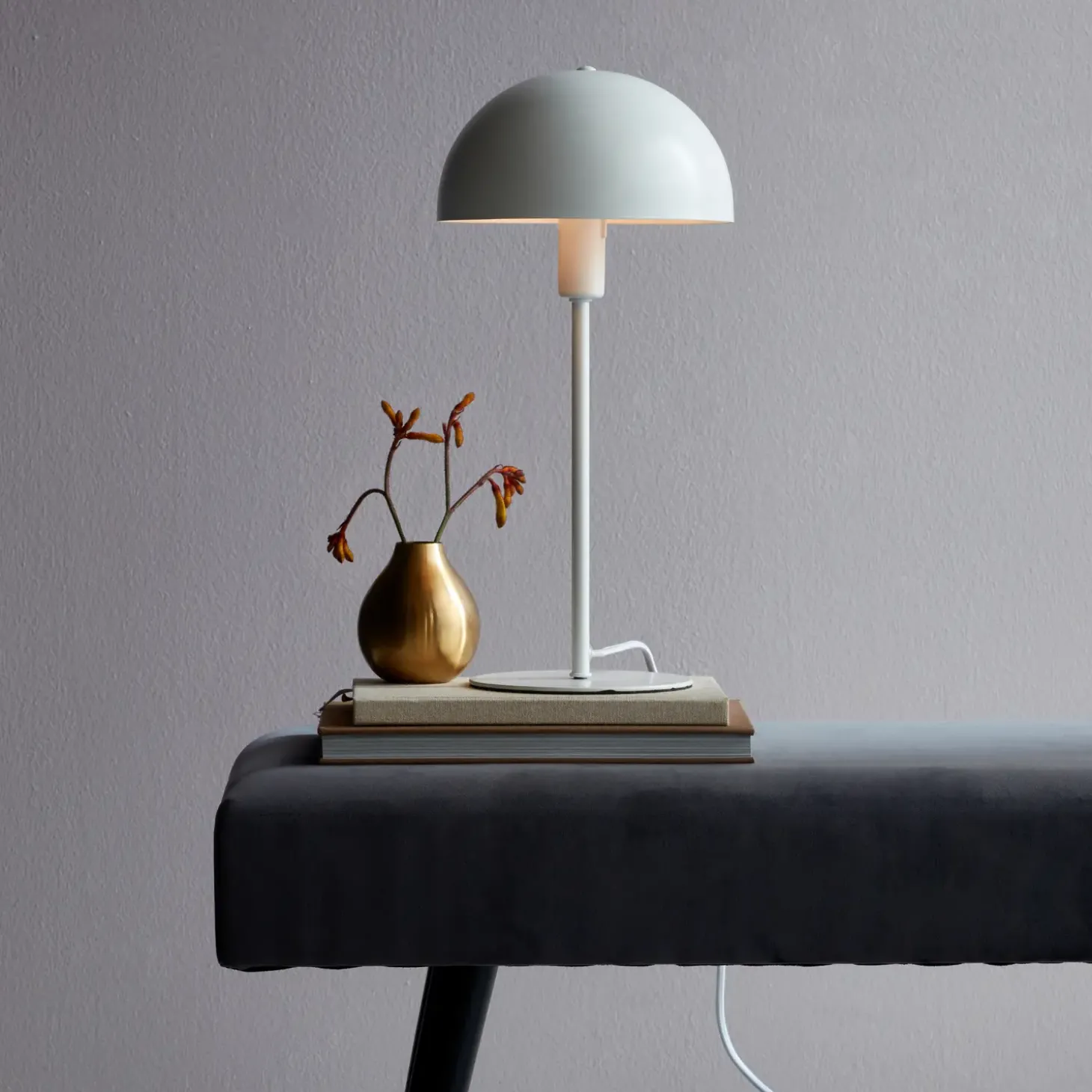Nordlux Ellen bordlampe med et enkelt og nordisk design, der kommer til udtryk med den runde form. Bordlampen med den kuppelformede skærm giver en behagelig belysning og bredt lysfelt.