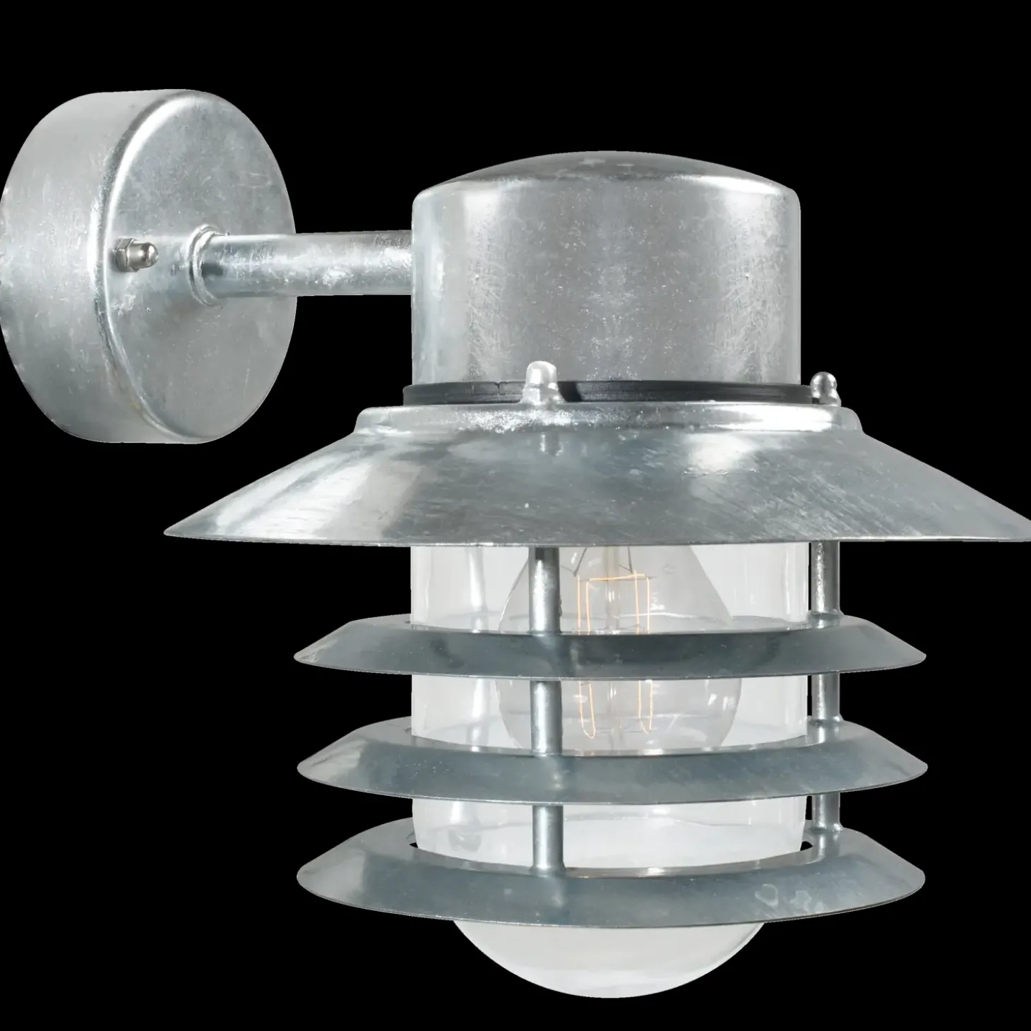 Flot vejers Down væglampe fremstillet i galvaniseret stål med klar glasfarve og nedadhængende lampeskærm, som egner sig godt til en indkørsel, indgangsparti, terrasse eller gårdhave. Det nedadrettet lys er ideelt, hvis du ønsker et markeringslys, eksempelvis nær hoveddøren eller ved trappen.