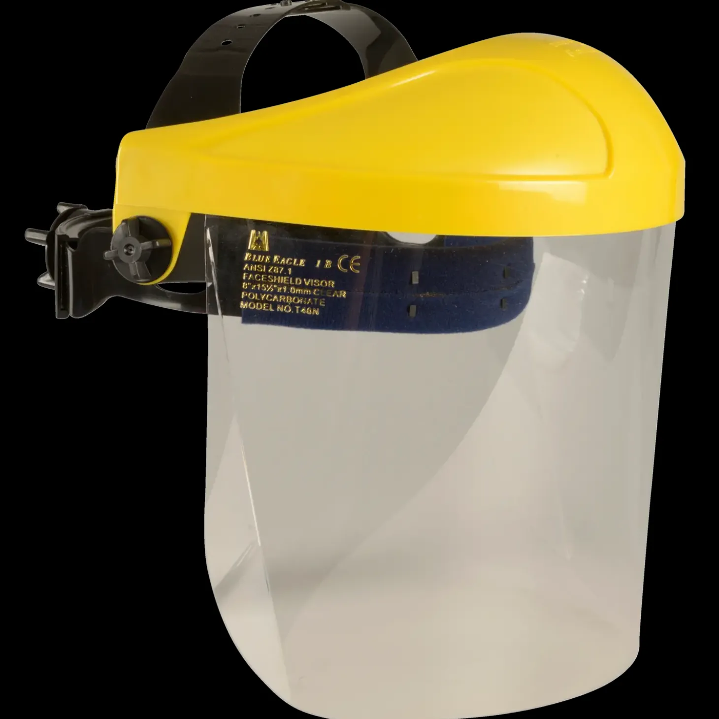 Ansigtsskærm med pandeskjold med opklappeligt visir af slagfast polykarbonat. Praktisk ved diverse slibearbejde.