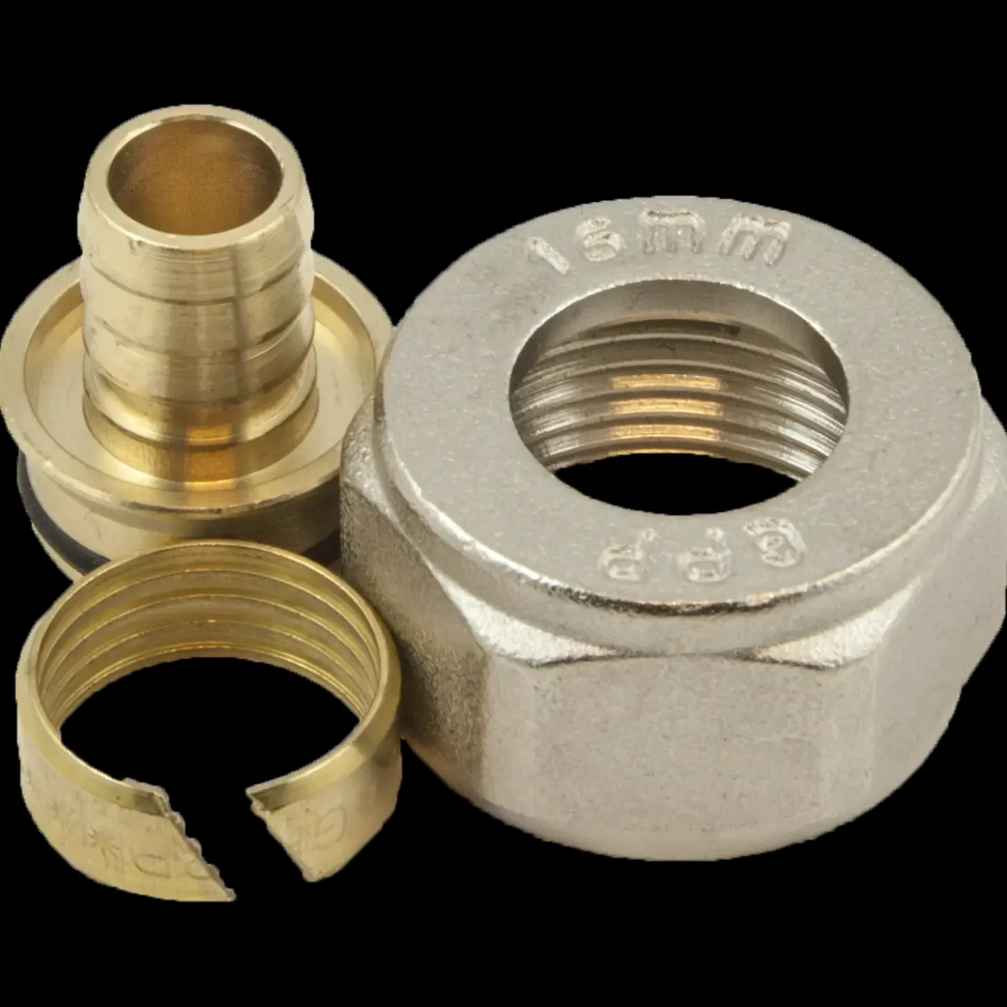 Fitting med fast støttebøsning, anvendes til samling af 16 mm REX gulvarmerør.