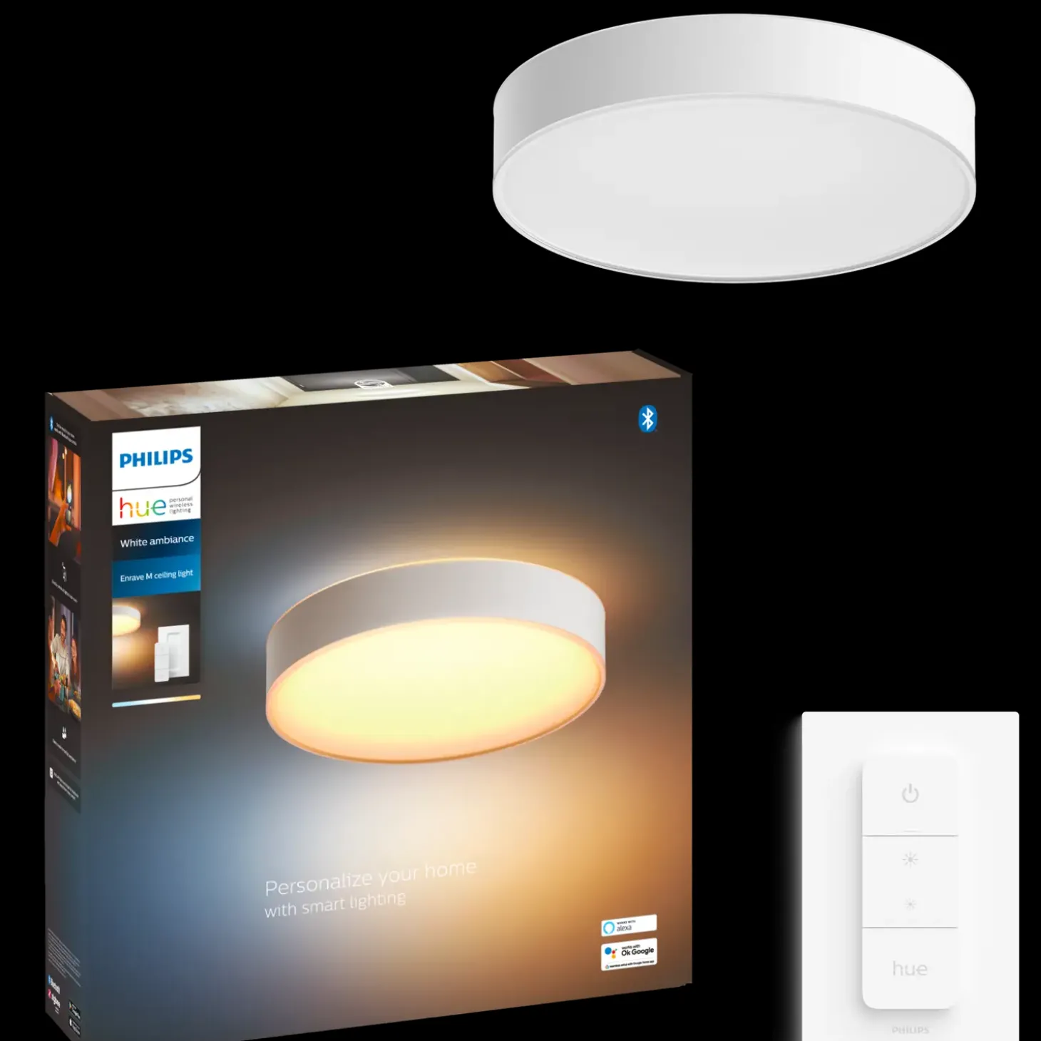 En familie af intelligente lamper i et moderne design og med en meget bred lysvinkel. Denne mellem Enrave loftslampe i hvid er ideel til at oplyse mindre områder i dit hjem som eksempelvis entré, bryggers og gangarealer, hvor den tilfører et blødt nedadgående lys til rummet. Med White ambiance får du mulighed for at tilpasse din belysning efter behov og sætte den helt rette atmosfære til dit hjem. Skift mellem kolde og varme toner af hvidt lys, og vælg mellem fire forudindstillede lysscener for at skabe den perfekte stemning til ethvert rum og enhver lejlighed. Du kan nemt kontrollere og justere lyset via din Hue app og ethvert Hue tilbehør.