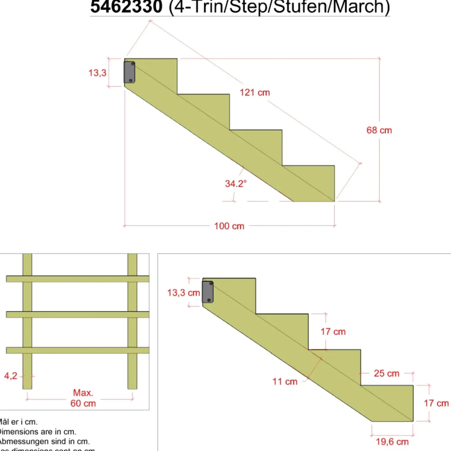 34,2° Træ Trappevange 4-trin m/beslag – Trindybde 25 cm – 5462330