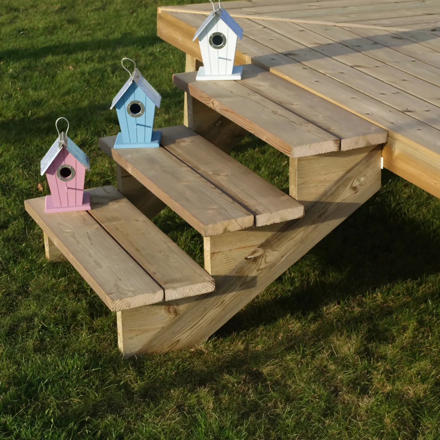 Ønsker du i stedet et komplet trappekit, så vælg vores trappevanger inkl. trinbrædder i trykimprægneret træ, beslag og skruer.
